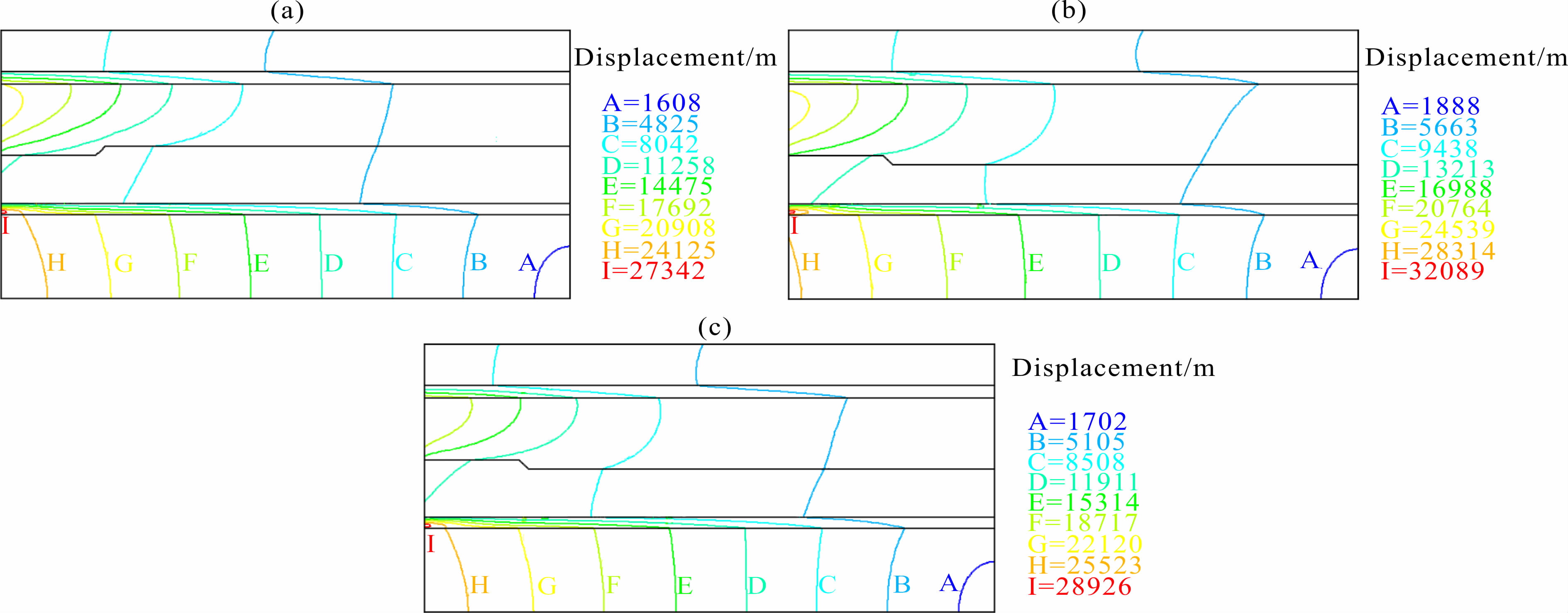 ![]() | 图 5(a)模型3位移场计算结果;(b)模型4位移场计算结果;(c)模型5位移场计算结果 Fig. 5(a)Calculated displacement field of model 3;(b)Calculated displacement field of model 4; (c)Calculated displacement field of model 5 |