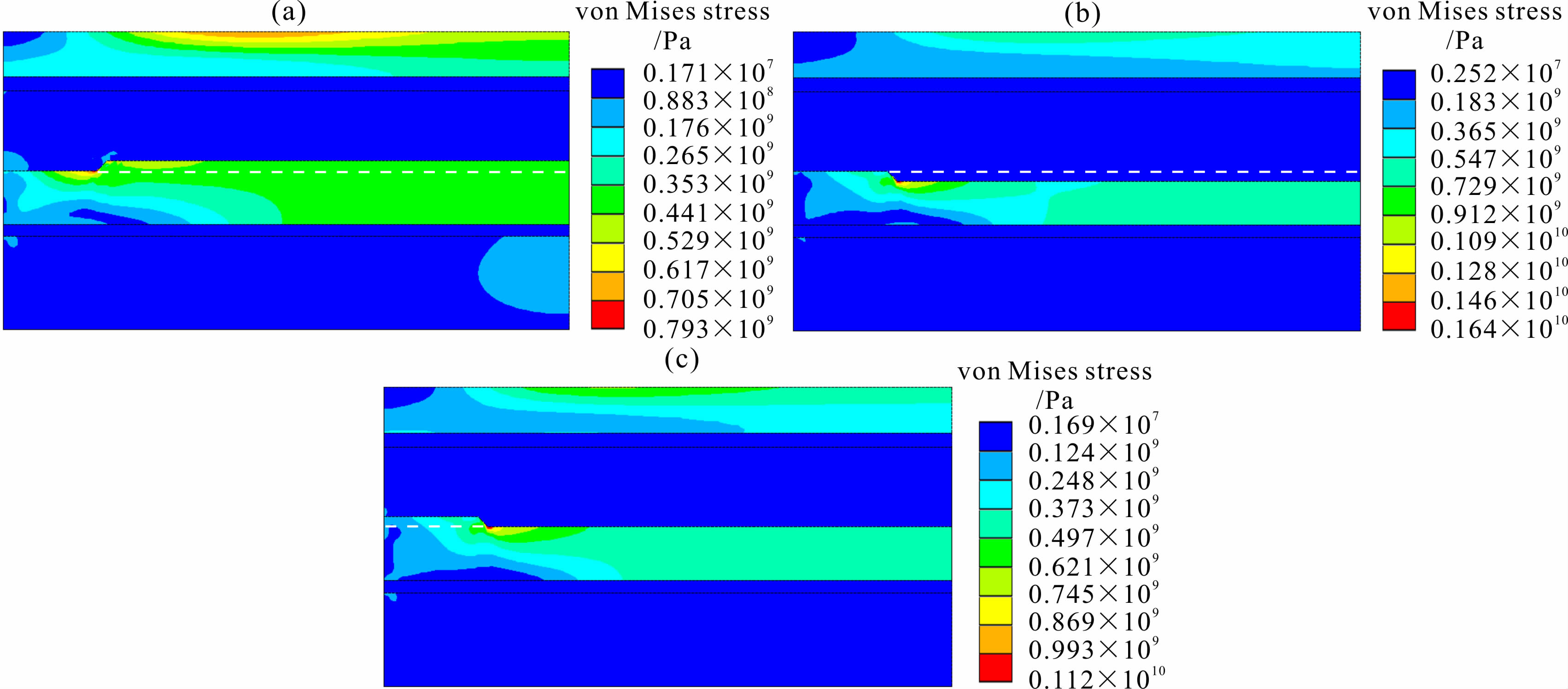 ![]() | 图 6(a)模型3等效应力场计算结果;(b)模型4等效应力场计算结果;(c)模型5等效应力场计算结果 Fig. 6(a)Calculated equivalent effctive stress field of model 3;(b)Calculated equivalent effctive stress field of model 4; (c)Calculated equivalent effctive stress field of model 5 |