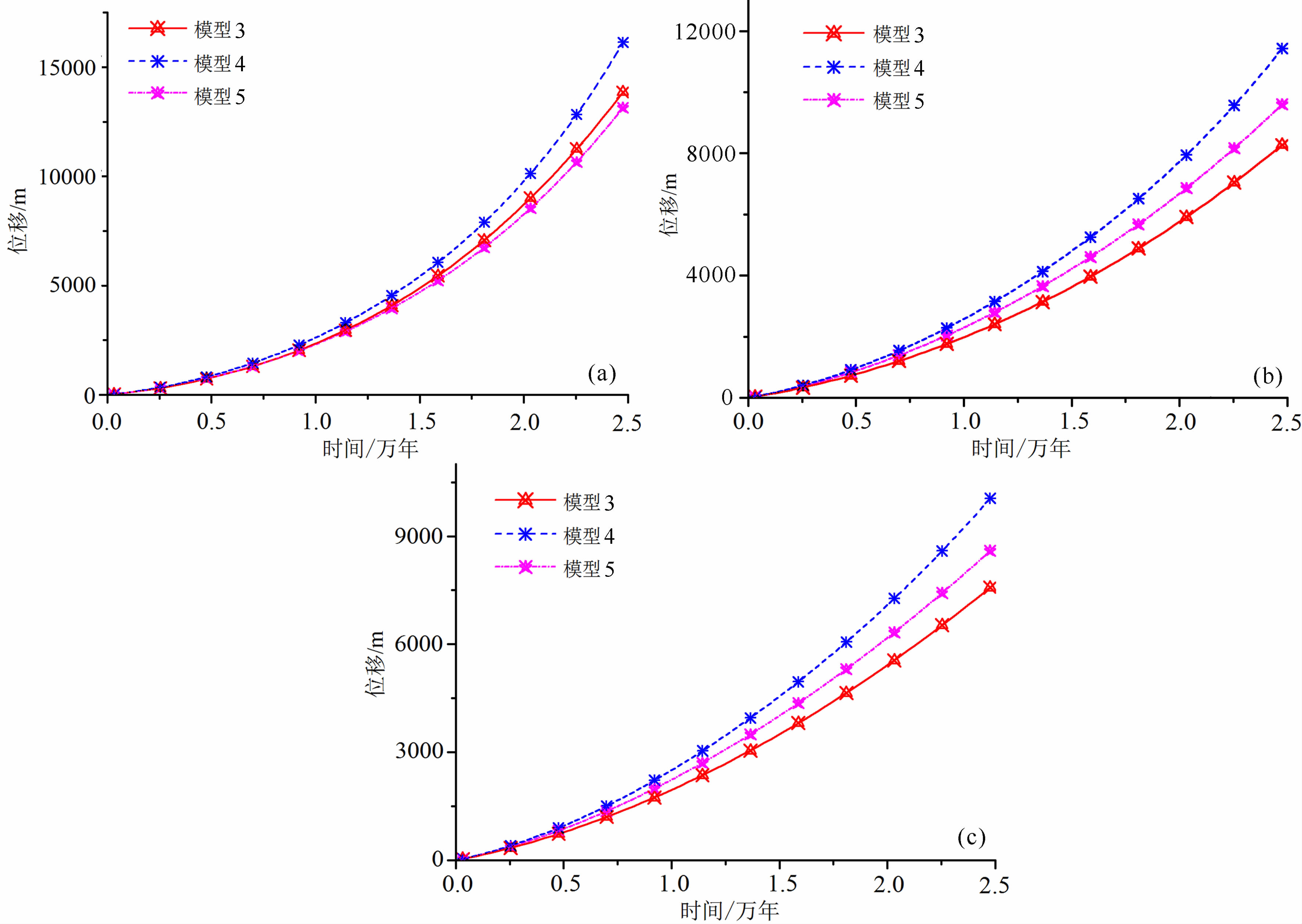 三个模型的地壳低速层水平位移量在万年时间尺度后的比较;模型5明显小于模型3和模型4,而模型3和模型5之间地壳低速层变形的差别一直较小.这一组模型的水平位移量是三组比较模型中最大的,这可能是因为地壳低速层强度弱而容易发生变形的原因.Moho界面处的水平位移量;三个模型的差异明显大于其间地壳低速层水平位移的差异量,且依然以模型4的位移量最大,模型5次之,模型3最小.Moho界面向下错断时对通道流中物质流动的影响最大.在岩石圈地幔与软流圈之间的滑 脱层(软流圈顶部)处的水平位移量显示出,三个模型的演变形态与Moho界面处一致,但其水平位移量的数值却是三个模型中最小的,这可能是与岩石圈地幔层速度高和强度较大,较难变形相关.三个模型的竖直向位移量随时间的变化形态均与水平向位移量随时间变化情况一致,在地壳低速层中三个模型的竖直向位移量最大,岩石圈地幔中的最小.当Moho界面向下错断5km时,其竖直向位移量较其它两种Moho界面错断情况相比达最大,在Moho界面边界抬升处次之,Moho界面向上抬升处最小.
