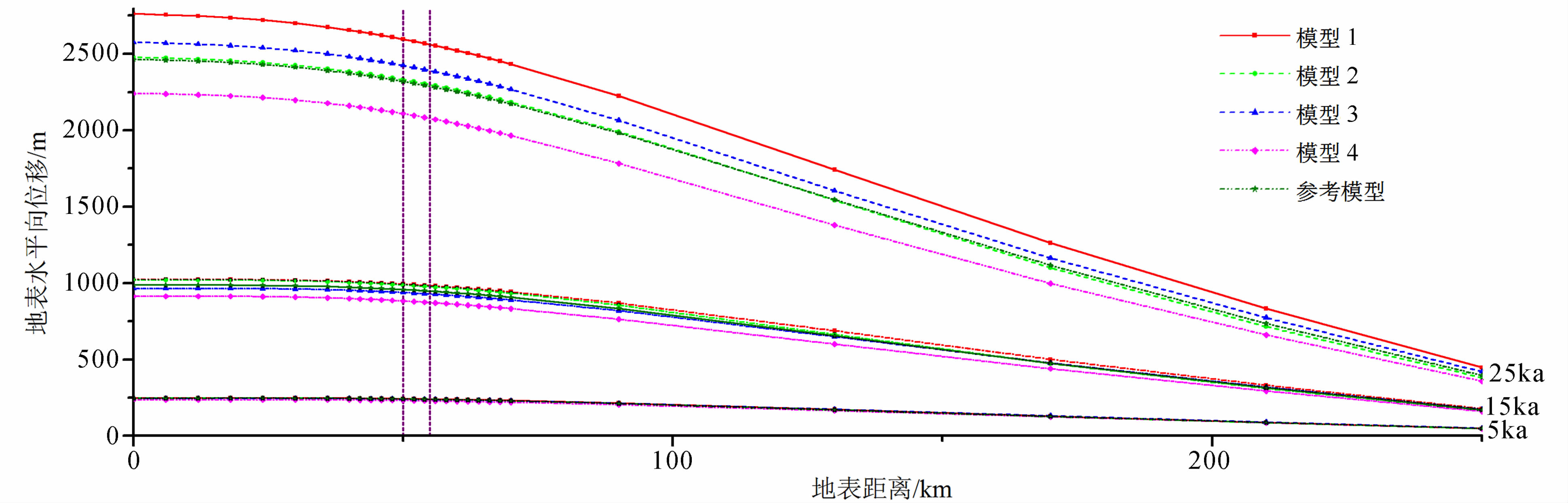 由图 8还可以看出,随离受力边界距离的增加,几个模型在地表的水平位移之间的差别也逐渐减小,超过200 km之后基本趋于一致.这便说明,通道流效应的作用有一定的作用区限.从时间效应看,5 ka的时候,尽管已经大于下地壳的特征松弛时间尺度,但几个模型之间尚无明显差别,而到了15 ka时却有了明显的变化.可见,在万年的时间尺度上,地表的水平位移已经受到了通道流效应的影响.从作用区限看,在Moho界面发生错断的地方,体现在地表的便是水平位移开始发生明显加速减小的地方.从作用效果看,模型1和模型4中虽然Moho界面的初始错断形态相同,都是下陷,但是在Moho界面变化相同的区域里,两者的地表水平位移并无明显相似之处.因此,模型深部动力学效应与地表的响应并非局部性的效应,而至少体现出了区域性的响应.