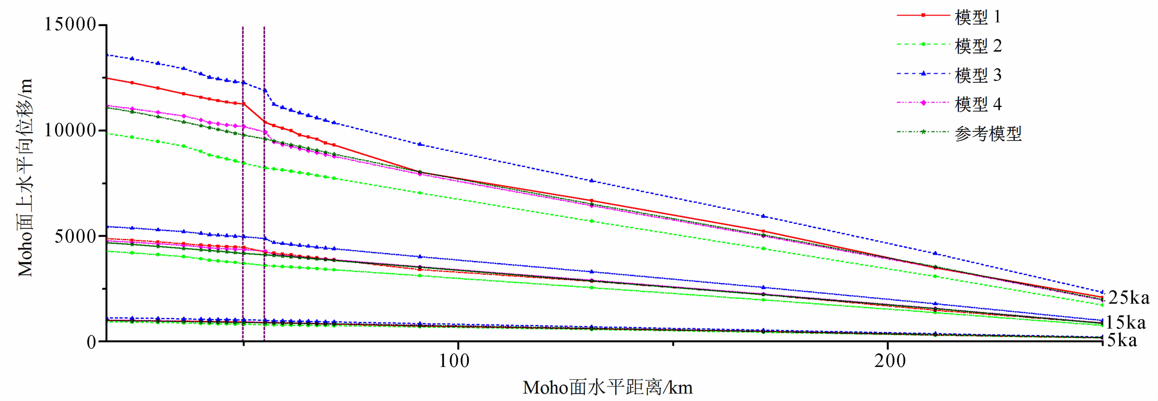 图 9显示的是Moho界面水平位移与水平距离关系的对比关系图,与图 8相比,地表和深部的水平位移对应关系并不耦合,出现了解耦的现象.但是,总的说来,从时间效用看,大致到了15 ka的时候,几个模型之间的Moho界面水平位移量则出现了明显的差别.