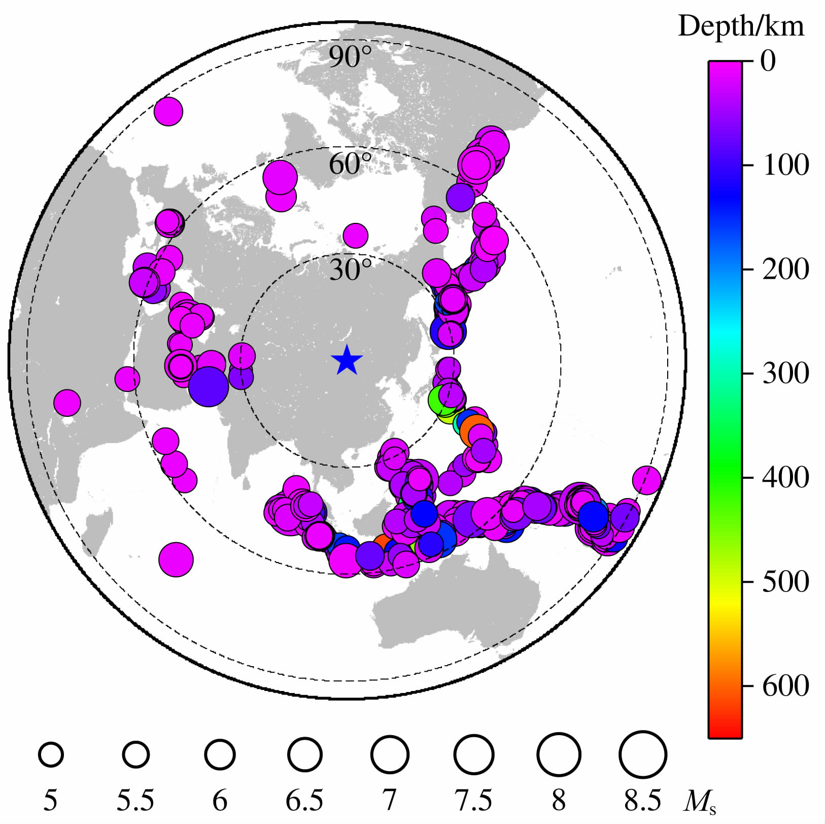 ![]() | 图 2 地震事件的震中分布图 Fig. 2 The distribution map of the epicenters |