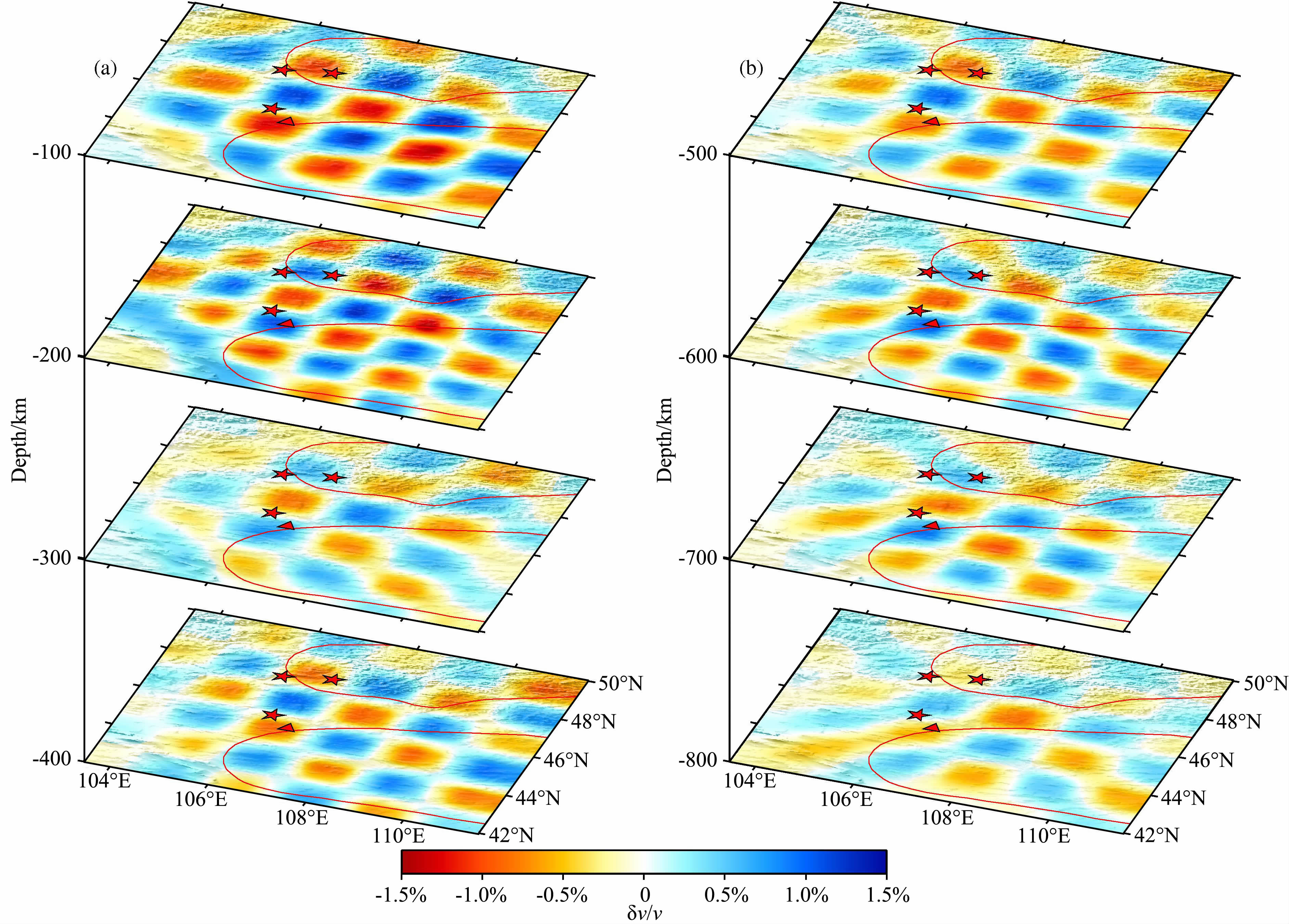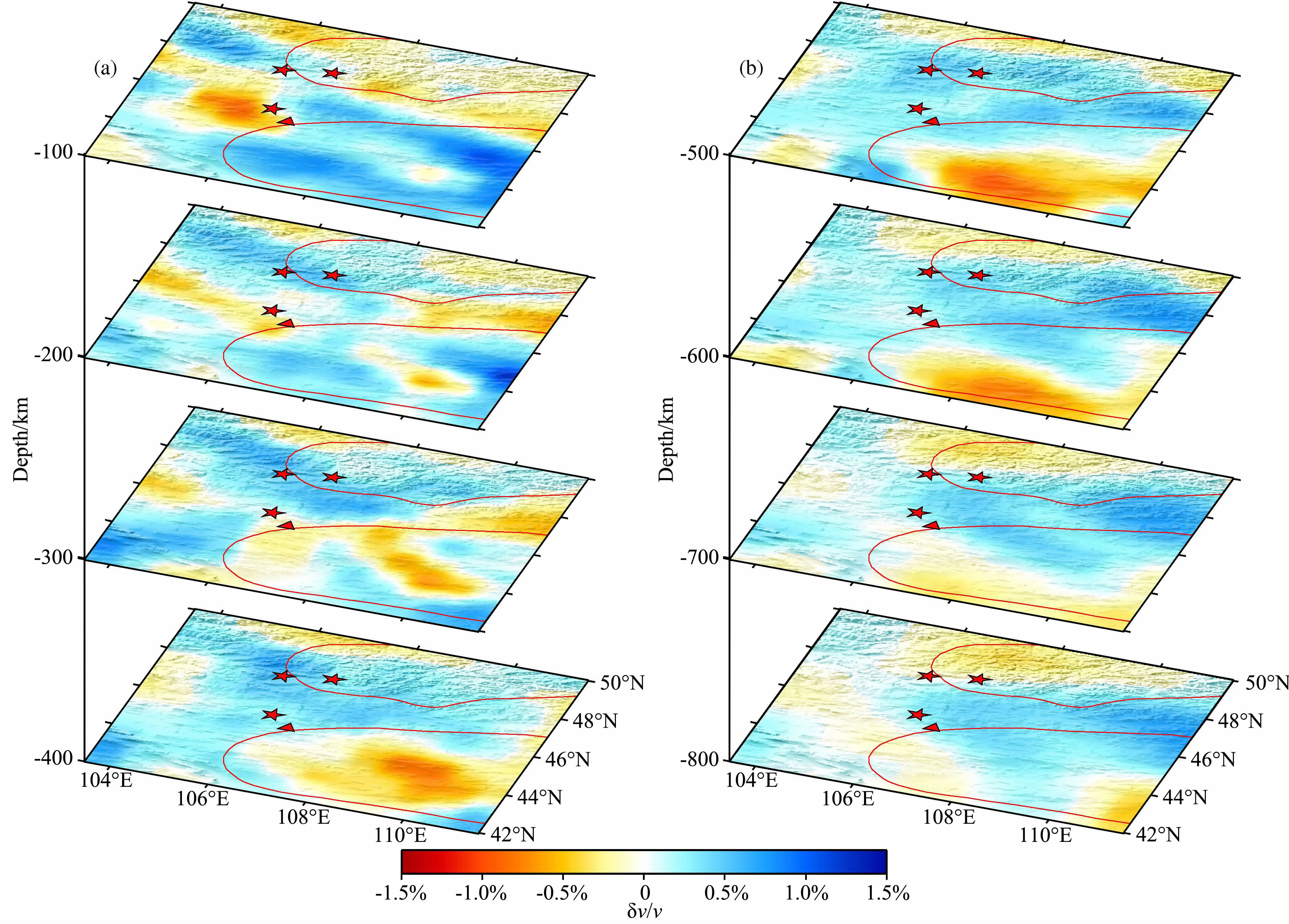 (1)乌兰巴托以东的肯特山下方存在低速异常结构,由于台站覆盖范围和分辨率等原因我们还不能完全确定该低速异常的具体埋深,但可以推测,此异常构造反映了肯特山地幔柱的低速特性.呼斯坦瑙鲁和曼达尔戈壁以西的低速异常可能和杭爱山下的地幔柱或地幔对流有关联.
