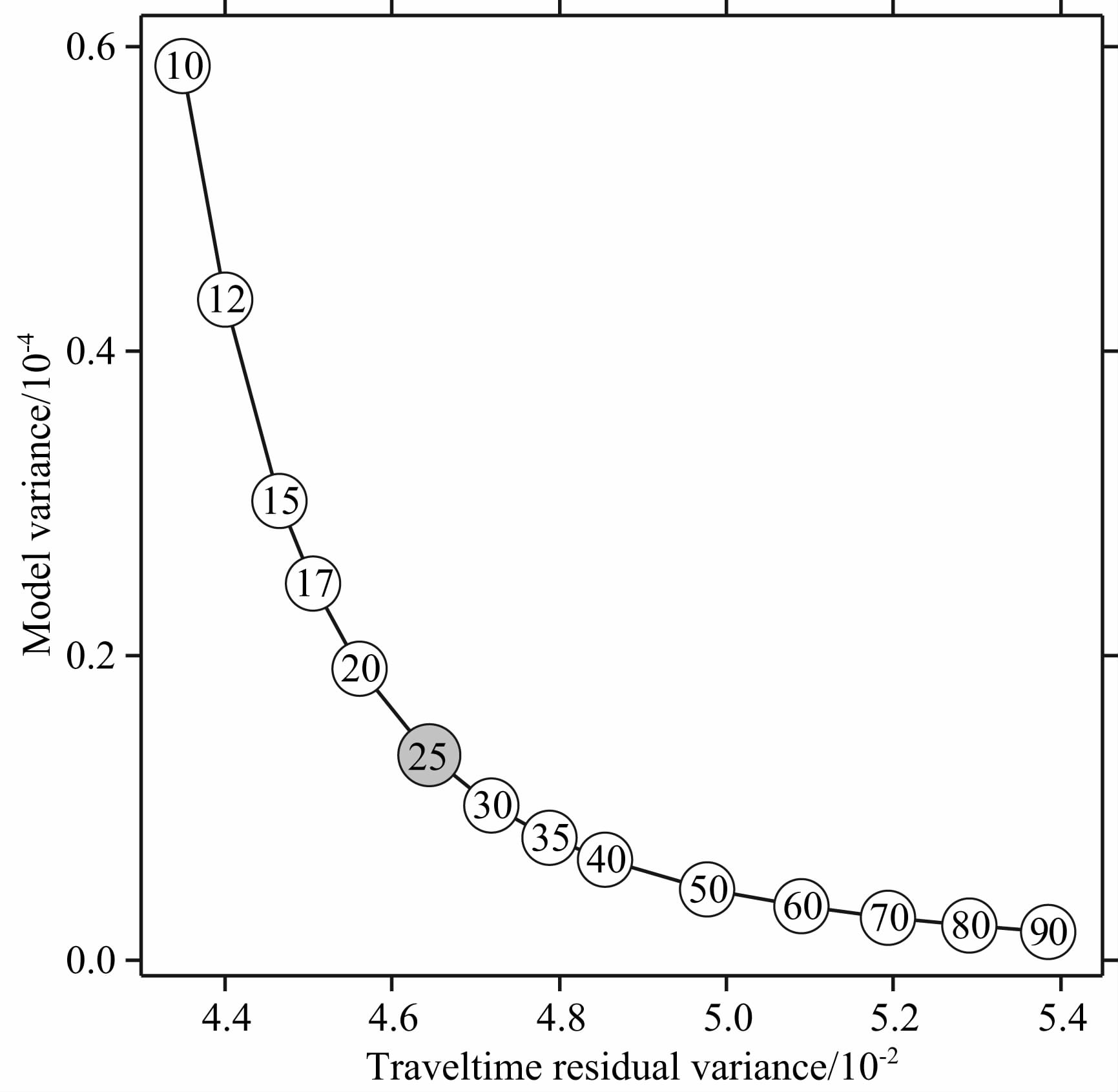 ![]() | 图 4 折衷曲线 采用不同阻尼因子进行反演所得相对走时残差均方差(横轴)和速度异常均方差(纵轴)之间的消长关系曲线. Fig. 4 The tradeoff curve Relative traveltime residual variances(horizontal axis) and velocity model variances(vertical axis)by conducting serial tomographic inversions with different damping factor values. |