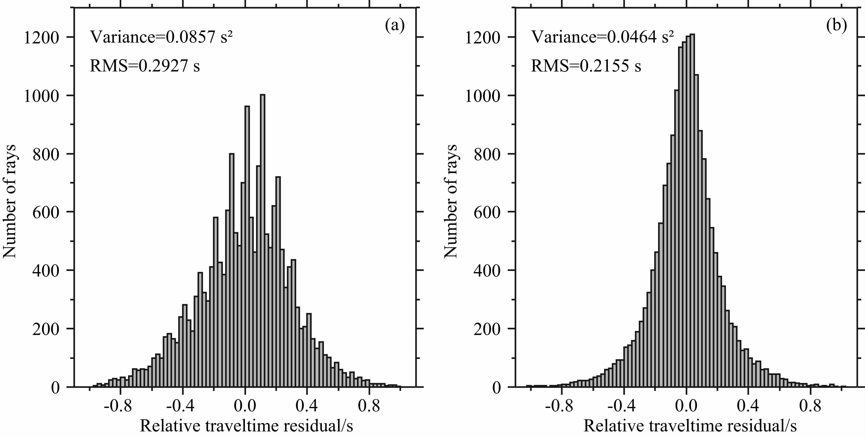 ![]() | 图 5 反演前(a)、后(b)相对走时残差统计 Fig. 5 The statistic of the relative traveltime residuals before(a) and after(b)inversion |