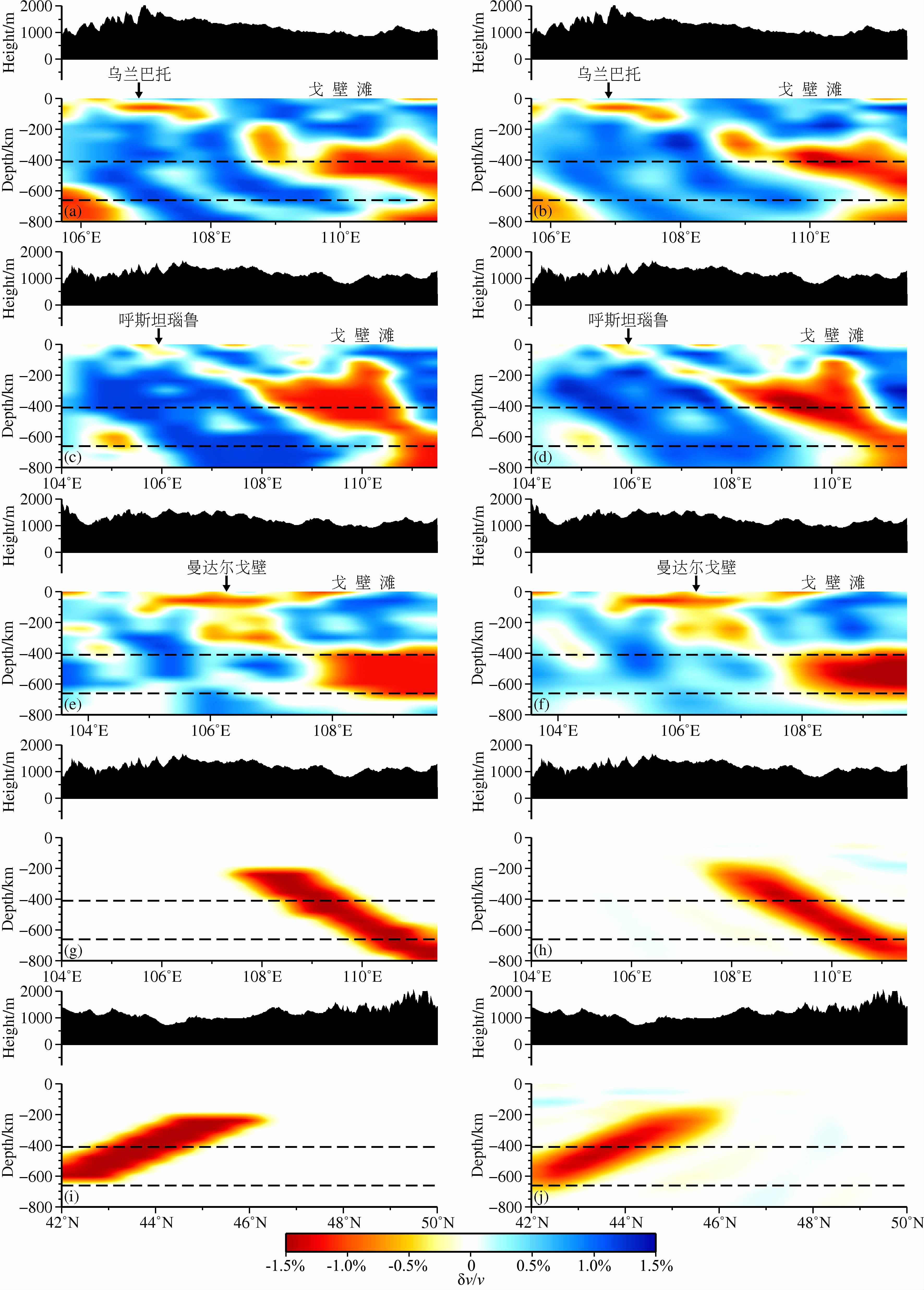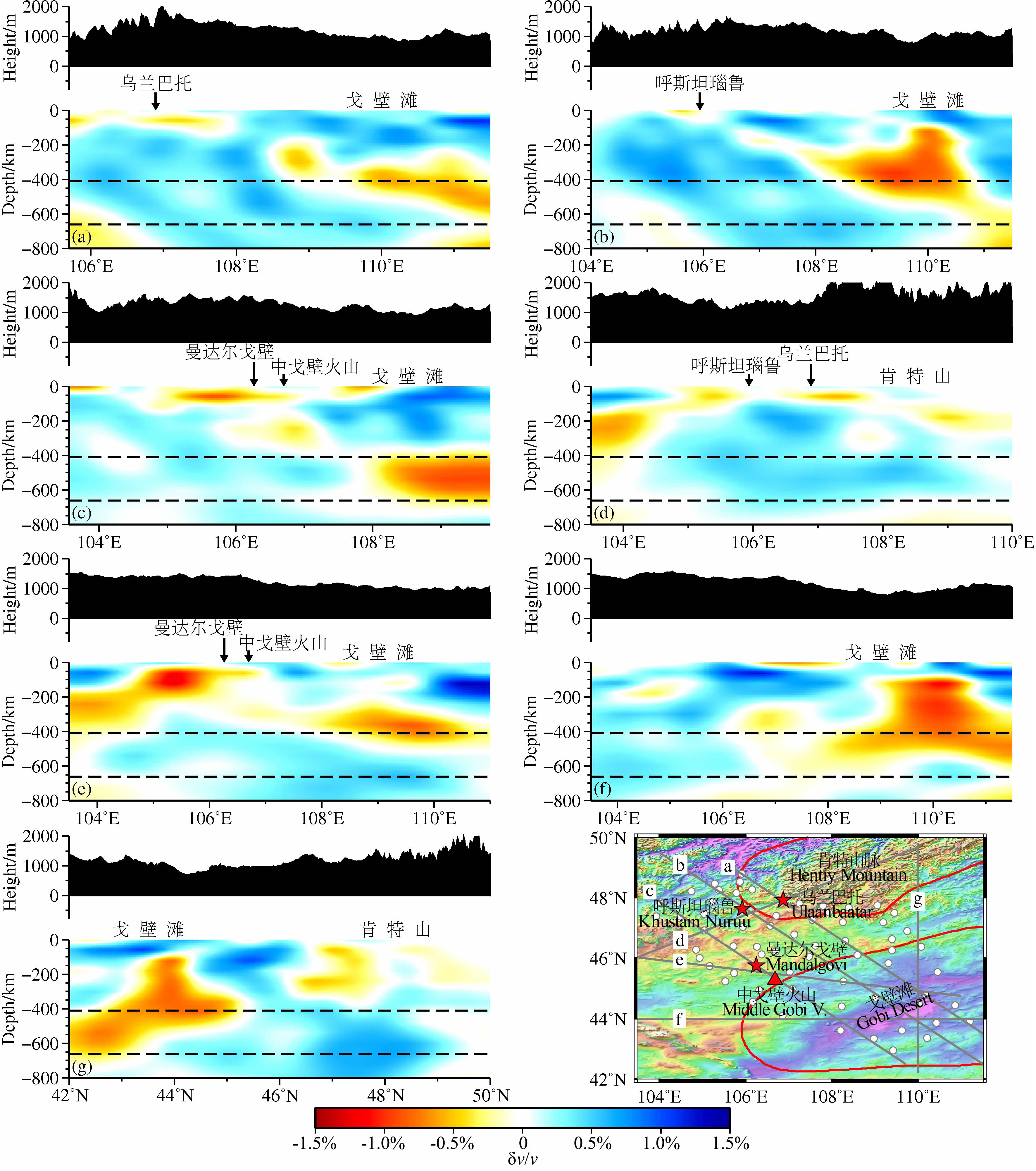 在100 km深度的切片上,乌兰巴托及肯特山地区表现为一大范围的低速异常区,呼斯坦瑙鲁、曼达尔戈壁(中戈壁火山附近)及其以西地区也为低速异常区,研究区南部的戈壁滩地区为高速异常区;随着深度的增加,肯特山下的低速异常逐渐淡化,在200 km和300 km的切片上表现为向高速异常过渡的状态,在400 km至800 km的切片上肯特山地区呈现出北部低速异常,南部高速异常的特征.呼斯坦 瑙鲁和曼达尔戈壁及其以西的低速异常大约在300 km 以上有所表现,并且这个低速异常随着深度的增加有西移的趋势,而其他深度切片上主要以高速异常为主.戈壁滩地区在200~300 km的深度范围内转为低速异常,在400 km和500 km的切片上表现最为明显,并且此低速异常以南东的走向向下延深至地幔转换带中.图 7是在研究区所做的垂直剖面,剖面的具体位置见图 1中的灰色直线所示,从图 7中可见,在200 km以浅的部分,乌兰巴托附近的肯特山、呼斯坦瑙鲁和曼达尔戈壁地区为低速异常,戈壁滩为高速异常(图 7a—7c);在200 km以深的部分,曼达尔戈壁地区,即中戈壁火山下方的低速异常仍有显现并可向下追至约300~400 km的深度(图 7c和图 7e),戈壁滩下出现一大范围的低速异常(图 7a—7c,7f—7g),从图 7d和图 7e中可以看到在呼斯坦瑙鲁和曼达尔戈壁以西出现的低速异常有明显的西倾趋势.