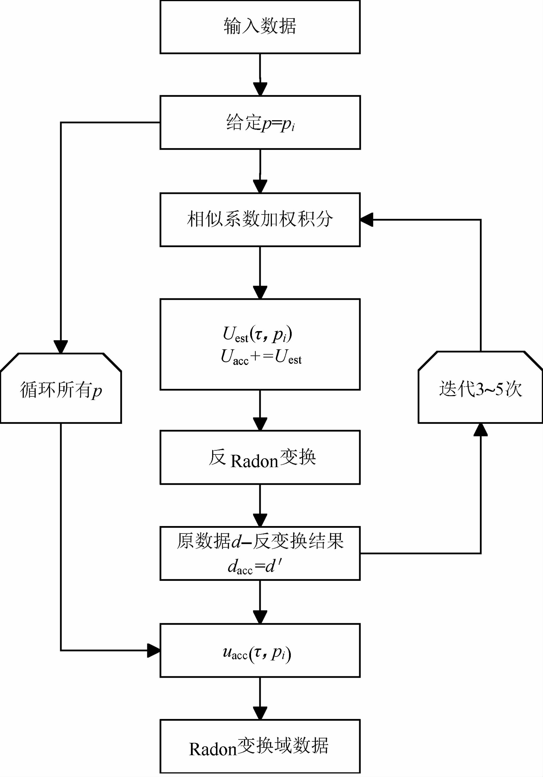 基于Gauss-Seidel迭代方式的相似系数加权各向异性Radon变换流程如图 1所示,在各向异性 Radon变换时,相似系数加权函数将由非双曲线时差曲线t(t′0,p,η,x)定义,即按公式(9)计算,变换流程可分三个步骤进行: