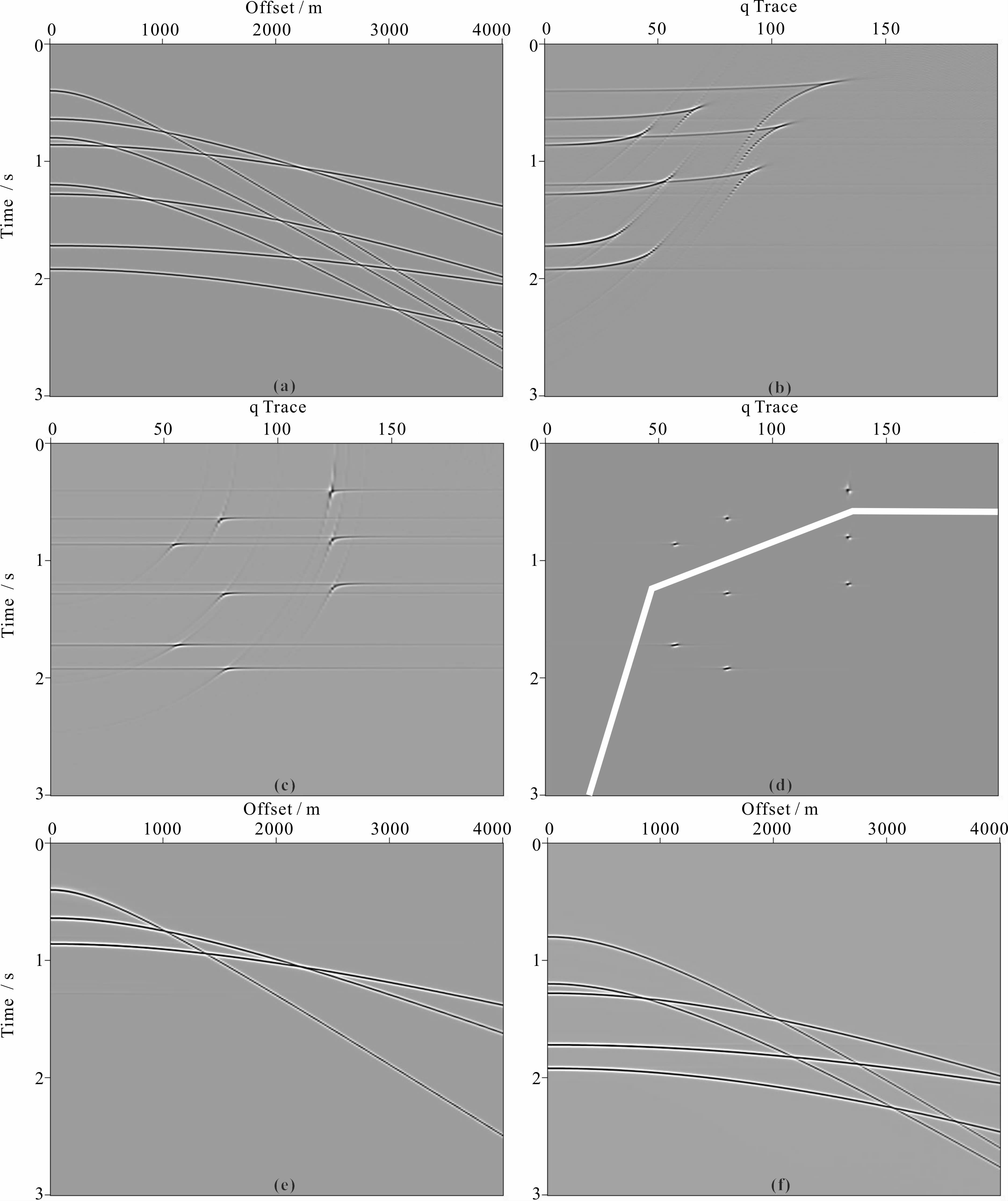 3 实例计算 3.1 各向异性介质模型建立如下的各向异性介质模型,模型参数如表 1 所示,模拟数据为200道数据,偏移距范围为0~4000 m,分别用抛物、双曲与各向异性Radon变换进行正变换,得到的Radon域内数据如图 2,图 2a为VTI介质单炮记录,其中一次波的零偏移距t0分别为0.4 s、0.64 s、0.86 s,多次波零偏移距t0为0.8 s、1.2 s、1.28 s、1.72 s、1.92 s;图 2b为抛物Radon正变换结果,非双曲走时的同相轴经抛物Radon变换之后,能量并不收敛,有明显的拖尾现象;图 2c为双曲Radon正变换结果,Radon域内能量已经收敛较好,但仔细观察细节,能量团仍不集中,能量最强的中心位置两侧有一定的能量延伸;图 2d为各向异性Radon正变换结果,从图中可看到,经各向异性Radon正变换后,变换域内能量收敛几乎与模拟时的子波相同,结果有着极高的分辨率,设置图 2d白线所示的切除线,白线之上为一次波能量,之下为多次波能量;图 2e为在各向异性Radon域内切除多次波后反变换结果,得到的一次波的记录;图 2f为在各向异性Radon域内切除一次波后反变换结果,得到的多次波的记录,可见通过各向异性Radon变换,多次波与一次波可明显分离,且原道集同相轴的振幅保持很好.对比抛物、双曲与各向异性Radon变换的计算效率,环境为Intel Core2,主频2 GHz,Intel C++ Compiler XE 12.1.2.278并行编译器,三者计算时间分别为1.2 s、8.5 s、9.1 s,可见各向异性Radon变换计算量与双曲Radon变 换相当,采用相似系数加权的Gauss-Seidel迭代算法计算效率较高.
