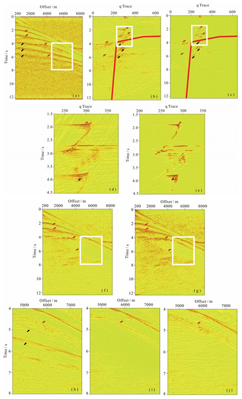 本文对比常规双曲Radon变换与各向异性Radon变换,其Radon域内变换结果分别如图 4b和图 4c,由于采用了非双曲相似系数加权的高分辨 率Gauss-Seidel迭代算法(2.4节),各向异性Radon 域内有效波与多次波能量相比于常规双曲Radon变换聚焦更好并已得到了有效的分离,见红色箭头所示的一次波与黑色箭头所示的多次波,将图 4b和图 4c中白框所示范围放大得到图 4d和图 4e,细节上对比各向异性Radon域比常规双曲Radon变换能量更为集中,便于设置切除线.设置如图 4b和图 4c所示的切除线,将切除线下方多次波的能量进行切除,反Radon变换后的结果如图 4f和图 4g,与原数据相比,多次波能量压制的很好,大偏移距处一次波的信号并未损失,变换后的地震剖面的信噪比得到了较大的提高.图 4h、4i、4j分别对应图 4a、4f、4g 中白框所示的细节放大图,观测道集波场的细节,双曲Radon变换与各向异性Radon变换均对多次波有较好的衰减,而后者对一次波能量有更好的保护.