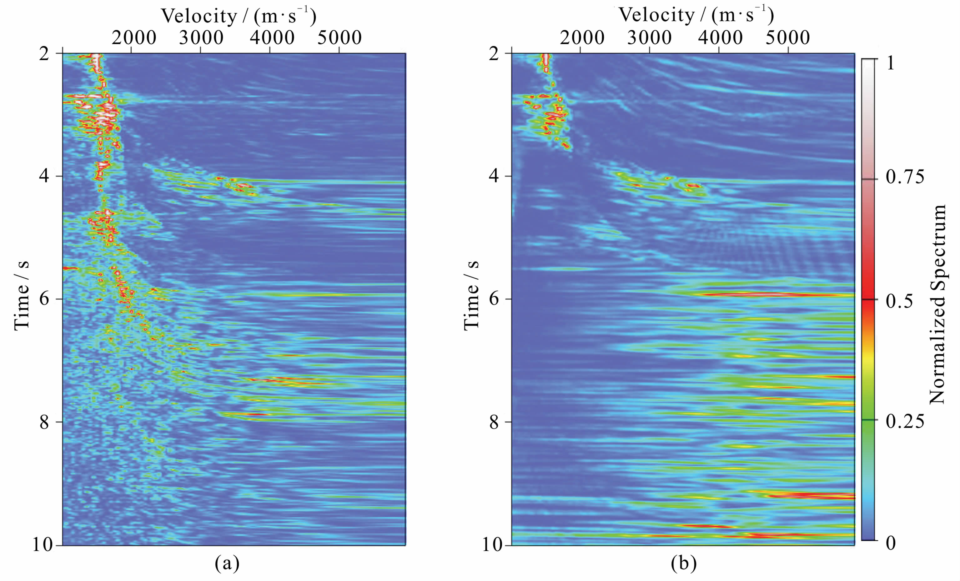 图 5是压制多次波前后的速度谱分析图,图 5a是原始记录的速度谱,1500m/s速度附近沿时间轴多次波的能量团十分明显,表现为速度相同时间等倍数一串相似的能量团;图 5b是各向异性Radon变换衰减掉多次波后一次波的速度谱,图 5a中时间大于4 s多次波的低速度能量团已经消失,在高速度范围出现速度谱能量团,也就是说深层的高速反射同相轴经过多次波压制后可以得到分辨.