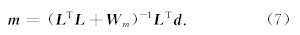 2.3 各向异性Radon变换离散求解基于反演理论的Radon变换,先定义反变换,从反变换导出正变换,可以在Radon域内得到分辨率更高的结果.各向异性Radon反变换公式(5)离散化,写成矩阵形式 d ′= Lm,其中算子 L 为各向异性Radon反变换算子,即公式(4)定义的积分路径,其物理意义将Radon域内的一个点变换到时空域内由x、p、η控制的一条曲线.Radon正变换算子为 L T,其物理意义将t-x域内由x、p、η控制的曲线变为Radon域内的一个点.采用最小二乘反演求解,并加入权系数矩阵 W m提高求解的分辨率,得到公式为