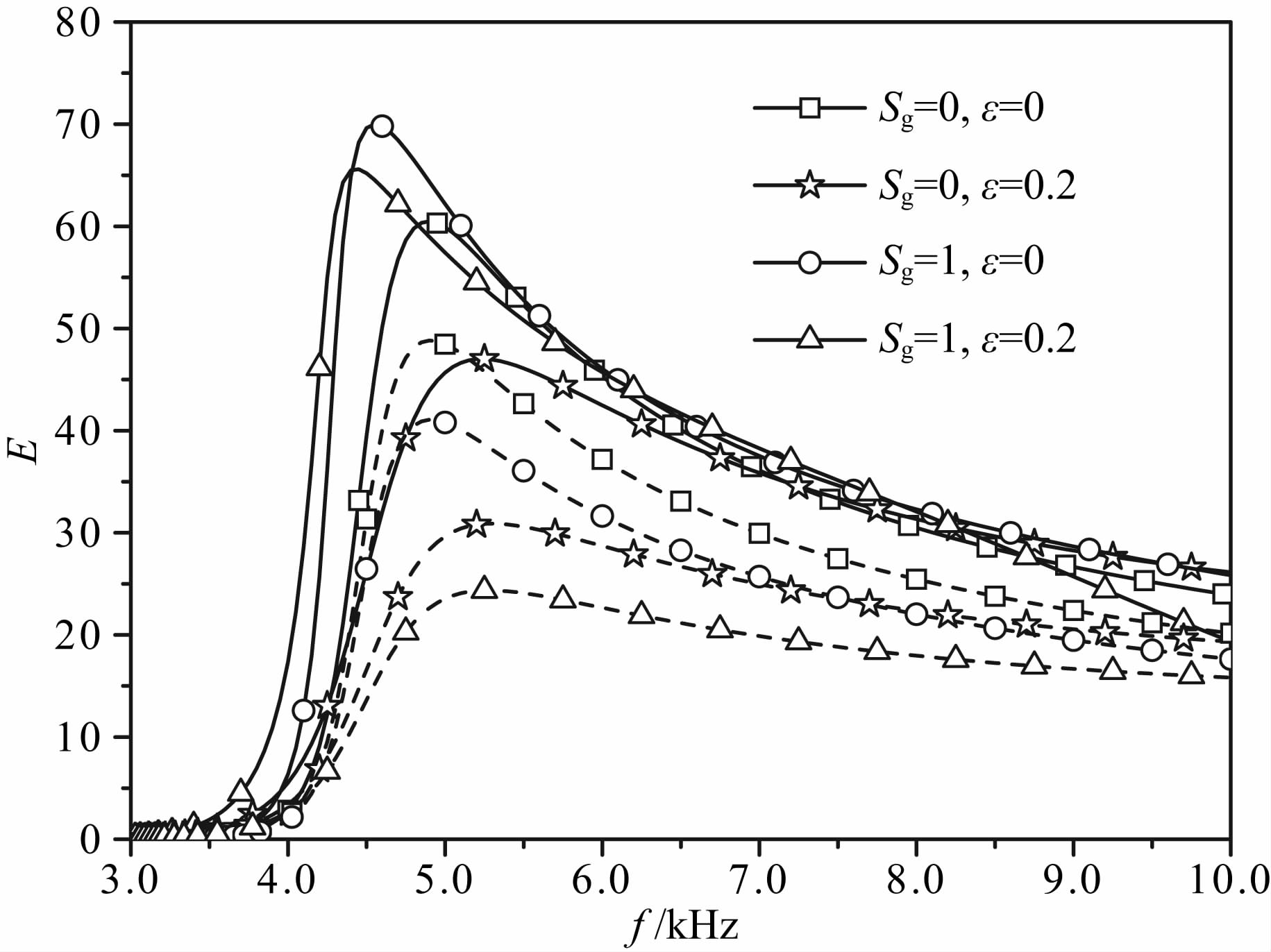从图 7表示的斯通利波的激发强度可见,闭孔边界条件下的激发强度(图中的虚线)比开孔时(图中的实线)低;不管开孔或闭孔,裂隙的存在均降低 了斯通利波的激发强度,且使得闭孔边界条件下低频斯通利波的激发强度趋于0.