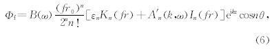 假定充液井孔中的流体密度为ρf,声速为vf,位于井轴上的n级多极子声源激发时,井孔中声场势函数在频率-波数域中的表达式为(陈雪莲和唐晓明,2012)