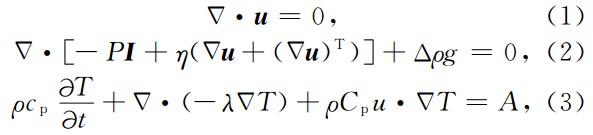 其中,u,P和T是分别速度、压力和温度.I代表单位对角矩阵.t是时间,η是地幔黏性系数,g是重力加速度.Cp,λ和A分别是比热、热导率和生热率. Δρ为密度异常,Δρ=ρ0αΔT,式中α是热膨胀系数.