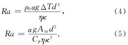 其中d是软流圈的厚度,κ为热扩散系数,其他参数含义如同公式(1—3). 根据表1中的参数值可得到Ra的数值分别为1.8×105和2.8×105,远大于触 发对流的最小临界值(Turcotte and Schubert, 2002), 这种情况下,流体地幔发生对流.