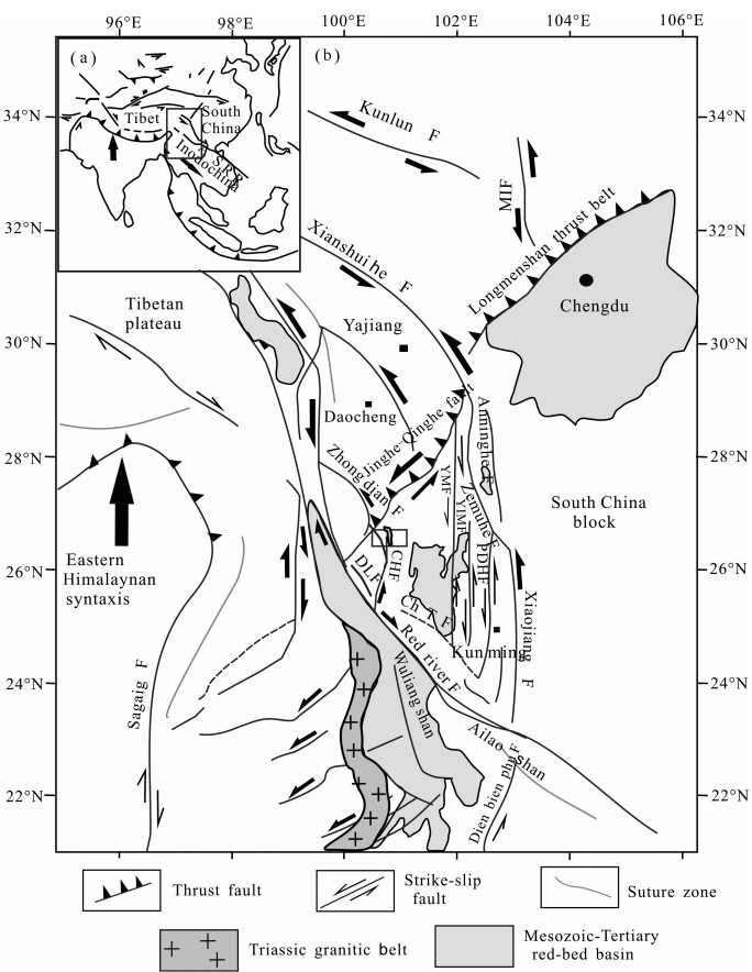 ![]() | 图1 (a)亚洲东南部构造简图,方框处代表研究区域(修改自Leloup et al., 1995); (b)华南川滇地块构造地质简图,图内黑色方框代表本次研究区域 DLF:大理断裂,CHF:程海断裂,CH T F:楚雄逆冲断裂,YMF:元谋断裂,YIMF:易门断裂,PDHF:普渡河断裂,MIF:岷江断裂. Fig.1 (a) Geological map of the Southeast Asia (modified from Leloup et al.,1995). Square represents the study area of the Chuan Dian Fragment. (b) Schematic map of the Chuan Dian Fragment. Black square is the sampling locality for this study DLF:Dali fault,CHF:Chenghai fault,CH T F:Chuxiong thrust fault,YMF:Yuanmou fault,YIMF:Yimen fault,PDHF:Puduhe fault,MIF:Minjiang fault. |