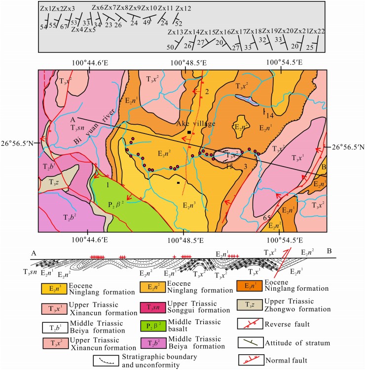 ![]() | 图2 研究区地质图 圆圈表示宁蒗组的样品位置,剖面中显示了走向和倾向方向. Fig.2 Geological maps of the study areas Sampling sites are shown by closed circles for the Ninglang Formations.Strike/dip orientations of strata are shown in insets. |