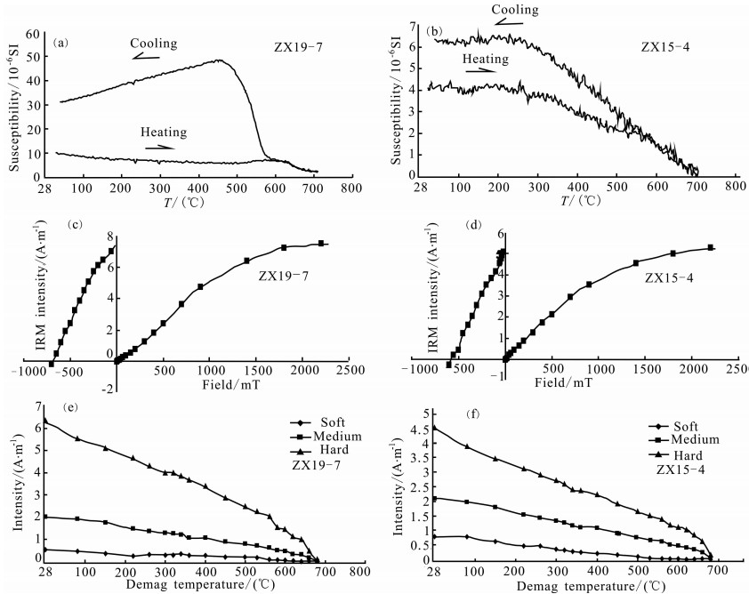 ![]() | 图3 部分代表样品的磁化率-温度(κ-T)曲线(a, b),等温剩磁获得曲线和直流反向场退磁曲线(c, d),三轴热退磁曲线(e, f) Fig.3 Thermomagnetic curves of susceptibility of the representative samples (a, b). Isothermal remanent magnetization acquisition and opposite field demagnetization curves of the representative samples (c, d). Thermal demagnetization curves of three-component IRMs for the representative samples (e, f) |