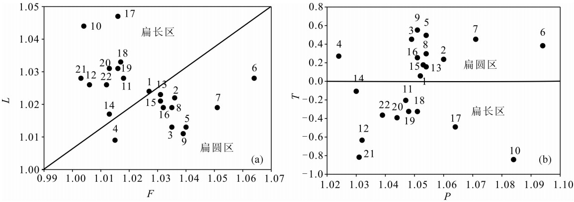 对22个采点的287块样品进行了磁化率各向异性测试,获得了样品磁化率各向异性椭球3个主轴的大小及方位,其中K1和K3集中分布方向代表了磁线理和磁面理极点方向.我们利用磁面理F,磁线理L, 各向异性度P和形态参数T等定义磁化率 各向异性椭球的形状,并计算出了表征组构特征的各项参数(表1).所有样品都表现出比较低的磁化率,各采点的平均磁化率(κm)分布在178.6286×10-6~317.65×10-6 SI之间.