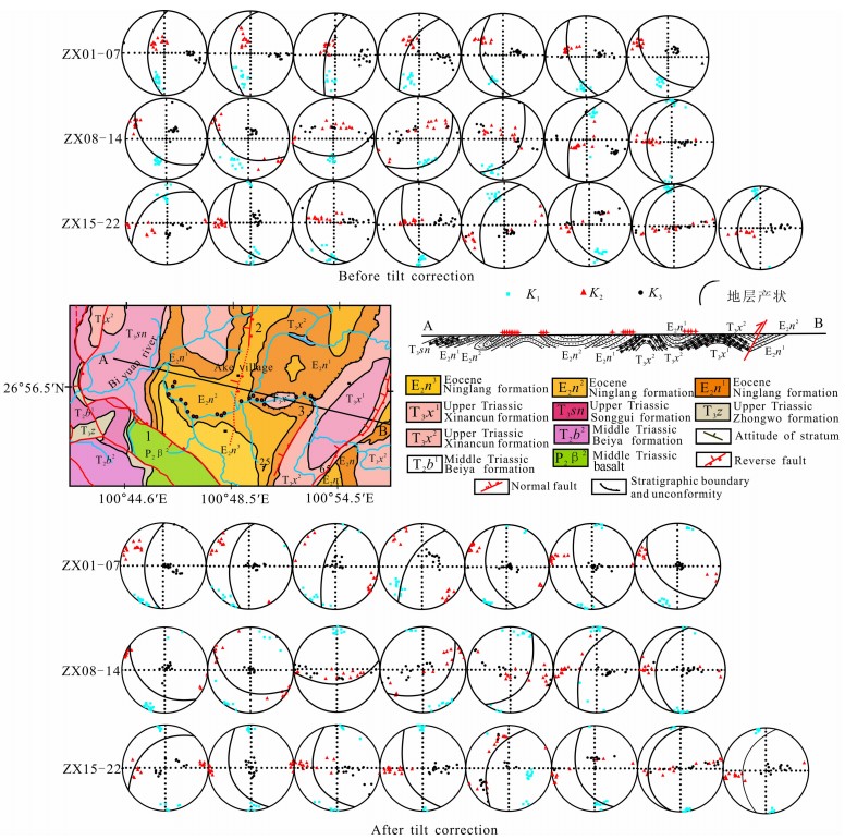 前述13—22与1—12号采点分布的区域存在相对的构造旋转,这与古地磁数据研究结果相一致, 采点1—12研究区相对于华南地块发生了大约16.7±6.0° 的顺时针旋转,而采点13—22所在区域相对于华南地块则未发生明显旋转(0.4°±5.7°),恢复区域主应力场方向,必须考虑到块体的旋转产生的影响.区域地质研究表明,上始新统丽江组角度不整合在下-中始新统高拉村之上,本区褶皱发生的时间应该在中-晚始新世之间,与思茅地区中生代地层褶皱时间相近,说明当时整个滇西地区可能发生过一次比较强烈的构造运动(张海峰等,2012).之后在上新世时伴随着鲜水河—小江断裂的强烈运动,川滇地块内部发生了不同程度的顺时针旋转,考虑到研究区地块的旋转变形时间明显晚于地层褶皱时间,并且后期的旋转改变了前期主应力场的方向,因此,恢复区域主应力场方向,必须校正后期的旋转运动.
