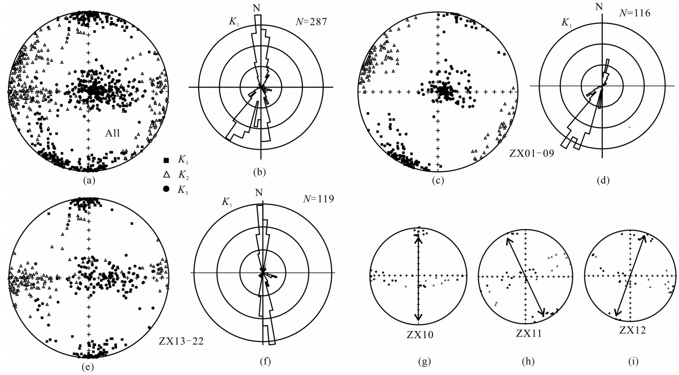 磁组构(AMS)又称磁化率各向异性,通常以一个三轴椭球体表示(K1≥K2≥K3,其中K1、K2和K3分别代表最大、中间和最小磁化率主轴),它反映岩石中磁性矿物的定向排列方向.多数应变状态下,磁化率椭球的三个主轴方向与应变椭球体基本轴之间具有很好的相关性(Borradaile et al.,1997;Hrouda,1982;Tarling et al.,1993),这使磁组构成为一种快速、有效地研究构造变形的方法,尤其是在其他应变指示计很少显示的弱应变地区,磁组构能够记录变形初始阶段的古应力状况,并且如果后期没有更大的应力影响,初始变形时的主应力方向不会被后期应力改造,可以较准确给出古应力形成以 及后期的应力变化状况(Cifelli et al.,2004;Larrsoanna et al.,2004;Parés,2004;罗良等,2008).
