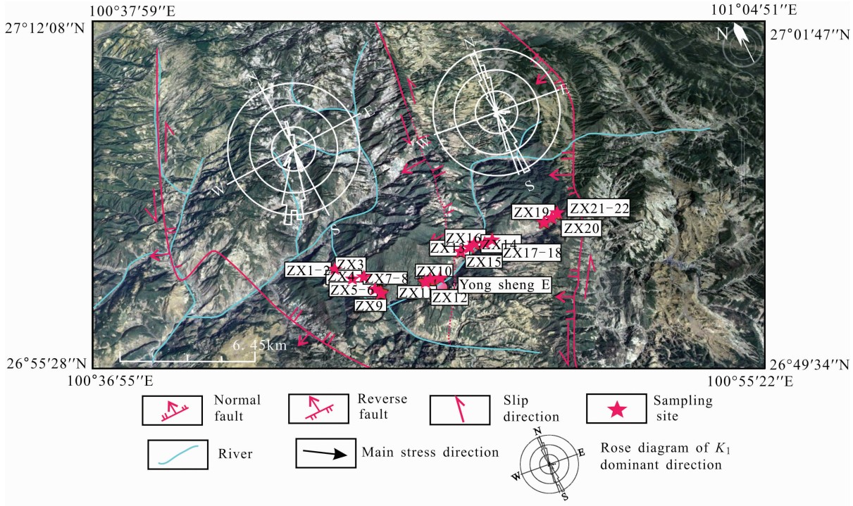 钱晓东等(2011)通过云南及周边地区中、强地震震源机制解参数的解析,详细分析了该区地震断层的类型和云南地区的现代构造应力场特征,结果显示滇西北地区,包括中甸、大理、丽江、宁蒗一带的现今区域应力场方向为S-N或者NNW-SSE方向(钱晓东等,2011;王绍晋等,2011).向宏发等(1986)则从第四纪以来的区域断裂构造的力学性质与活动方式,断陷盆地的结构形式与组合关系判断滇西北地区为NNW及近S-N向挤压的构造应力场.卫星影像解译,线性构造网络以及近千年来的中小地震均沿上述应力场作用下的近NW-NNW向及近S-N向共轭破裂面发生(阚荣举等,1983).近些年区内发生的中、强地震的极震区长轴也多为NNE向或NW-NNW向,说明这一构造应力场一直控制着该区现代地壳运动和地震破裂特征.该方向与我们获得的研究区内近E-W向的主压应力场方向有明显差异,说明中-晚始新世与第四纪以来的主压应力场方向发生了极大的变化,与区域动力学变化相关.