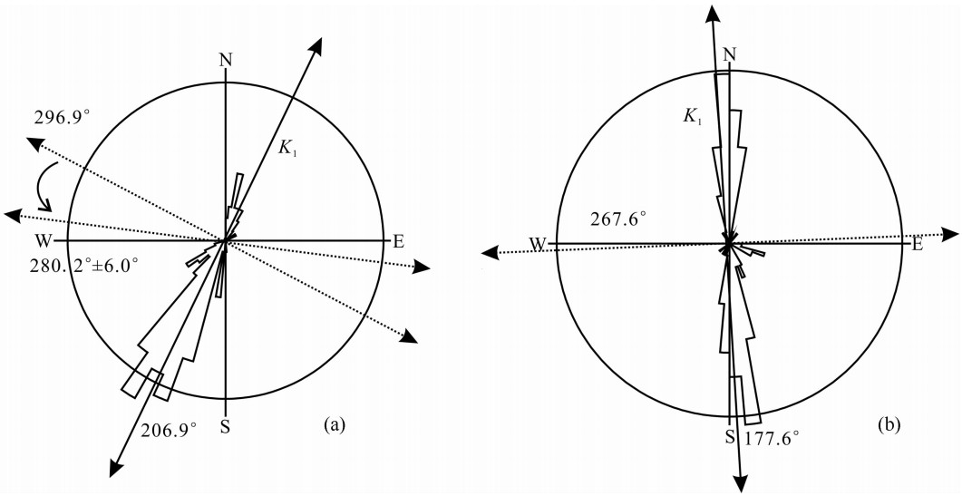 ![]() | 图9 主压应力校正示意图 黑色实线代表K1轴方向,黑色虚线代表主压应力方向,黑色箭头代表对主压应力方向进行逆时针旋转校正,(a) 代表1—9号采点,(b) 为13—22号采点. Fig.9 Diagram of principal stress correction Black solid line represent the direction of K1, black dashed line represent the direction of principal stress, Black arrow indicates the correction of the principal stress direction, diagram (a) from the sampling site of 1—9, and diagram (b) from the sampling site of 13—22. |