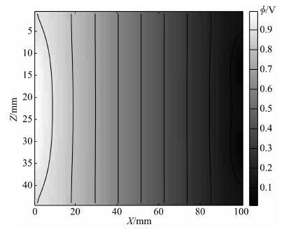![]() | 图 7 ZX平面无屏蔽电势分布Fig. 7 The potential distribution without shielding on the ZX plane |