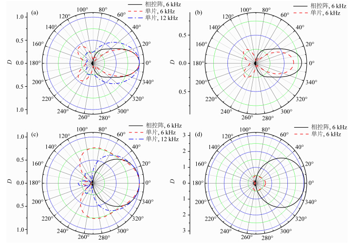 由于实际测量过程是在井孔中进行的,有必要分析将圆弧阵声源放置于井孔中时该声源向地层中辐射的声场.图 4是通过式(14)计算得到的不同频率下相控阵辐射器和单一阵元工作时向井外地层中 辐射的纵波场的水平指向性图,其中(a—b)和(b—d)分别为快速地层和慢速地层结果,接收器的位置如图 2中RA-1所示.由图 4可见,无论是快速地层还是慢速地层,在高频(12 kHz)下,钻铤的屏蔽作用使得单一阵元产生的声信号基本向着背对钻铤的方 向(0°)传播;在低频(6 kHz)下,对于快速地层,其 指向性图中存在较大的旁瓣;对于慢速地层,指向性图主瓣三分贝角宽较大,约为180°,辐射的声场不 适用于三维反射声波成像技术.针对不同的地层类型,采用了不同的相位控制方式,控制参数分别如表 2和表 3所示.如图 4所示,在低频情况(6 kHz)下,合理的相位控制方式可以使得声源向地层中辐射的纵波沿着特定的方位传播,其指向性图主瓣明显,三分贝角宽较小(快速地层,53.1°;慢速地层,94.3°),旁瓣级低.另外,从图 4b和4d可见,在快速地层情况下,相控阵声源在目的方位(0°)的辐射能量略大于单阵元;而在慢速地层情况下,相控阵的辐射效率约为单片阵元的5倍.上述研究证明了采用相控方式工作的圆弧阵辐射器在低频范围内也有较高的方 位分辨能力,适用于低频三维方位反射声波成像技术.