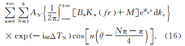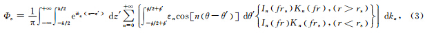 计算不同方位阶数n的声场(计算时,取n的上限为20),通过对波数积分可得到地层中坐标 r,θ,z 位置处纵波场以位移势形式表示的激发谱: