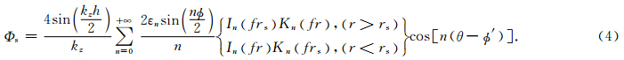在柱坐标系下,位置(r′,θ′,z′)处的点声源可以展开为任意方位阶数的多极子声场叠加的形式(Tang and Cheng, 2004):