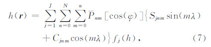 为连带勒让德函数(Associated Legendre Function);(φ,λ,h)分别表示网格点的纬度、经度和高度值;fj表示第j阶的EOF函数、J为EOF函数的最大阶数、N为SHA的最大阶数、Sjnm和Cjnm为待求解的权重系数. 通过级数展开,式(5)可以表示为