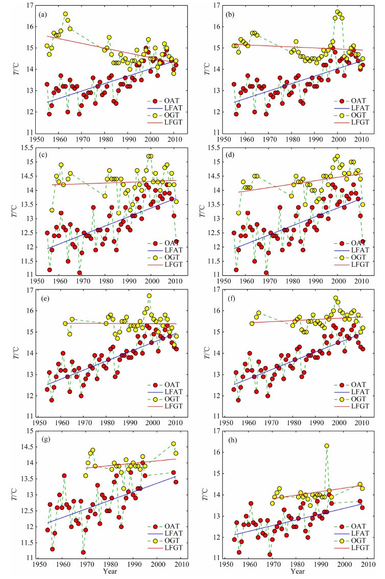 ![]() | 图 6 1956—2011年张家口气象观测站气温和(a)1.6 m、(b)3.2 m的地温数据 OAT表示实测气温值,LFAT表示气温线性拟合曲线,OGT表示实测地温值,LFGT表示地温线性拟合曲线.Fig. 6 Air temperature and the ground temperature at depths of(a)1.6 and (b)3.2 m at Zhangjiakou Station from 1956 to 2011 OAT st and s for observed air temperature,LFAT st and s for linear fitting of air temperature,OGT st and s for observed geo-temperature,and LFGT st and s for linear fitting of geo-temperature. |