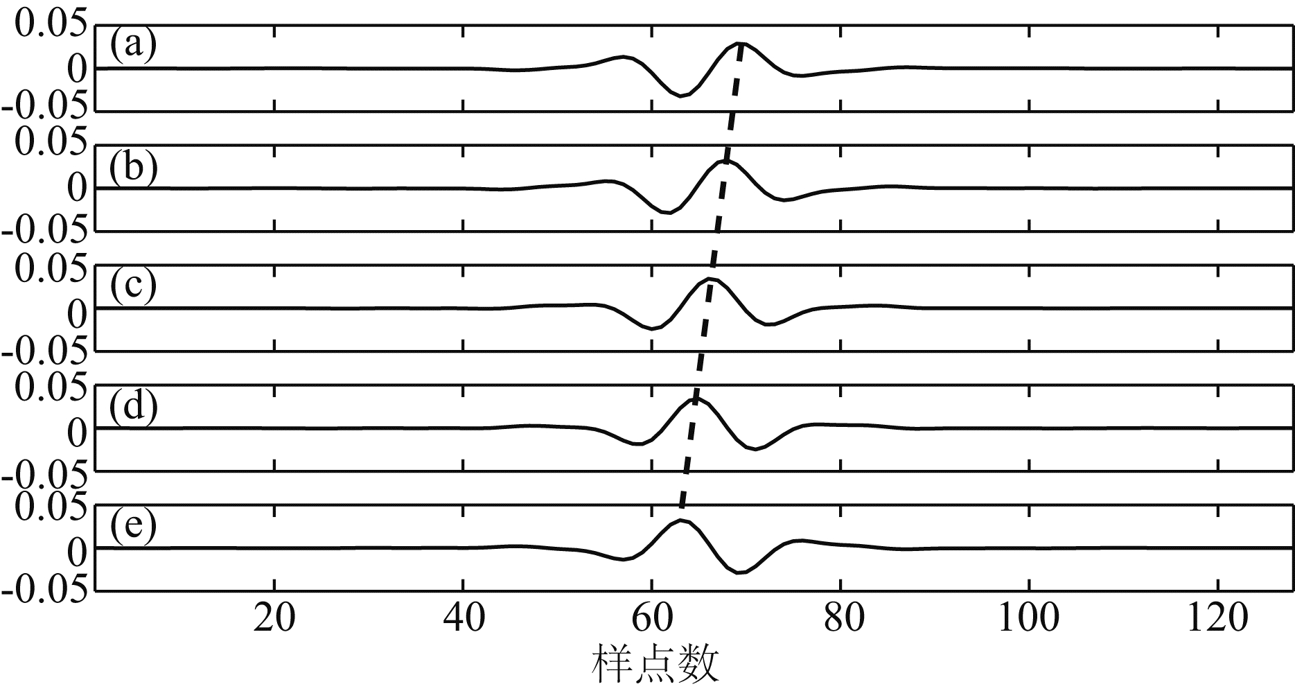 ![]() | 图 4 改变复曲波系数相位与地震数据相对应的复曲波函数的变化关系(a) π/2; (b) π/4; (c) 0; (d) -π/4; (e) -π/2.Fig. 4 Relationship between CCT coefficient phase and corresponding CCT function |