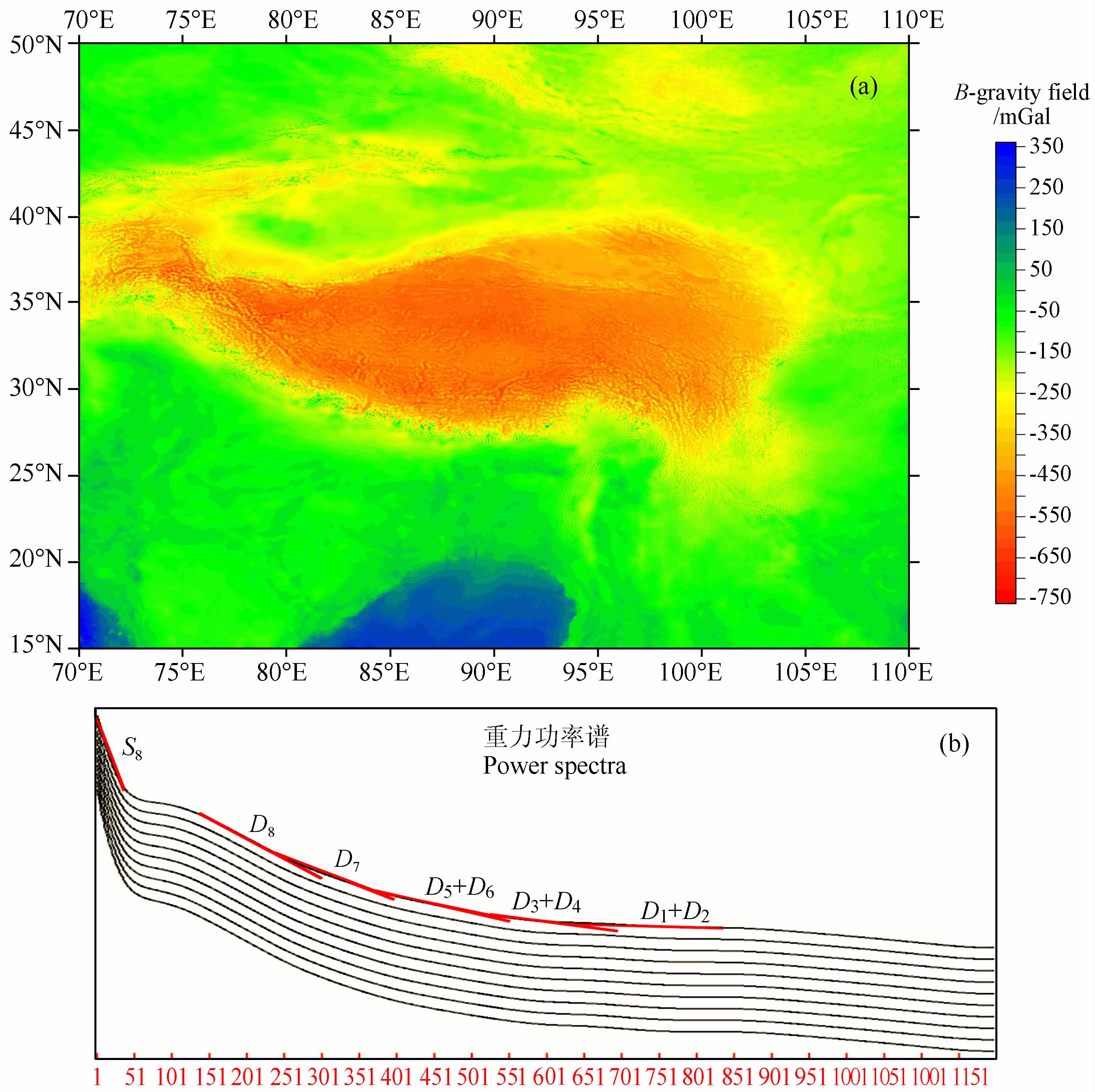 2 青藏高原区域重力场多尺度分解利用区域重力场的信息,揭示区域地壳三维密度结构与构造,成为现今区域地球物理学研究的主攻方向之一.在本世纪初国土资源部已经完成了青藏高原1∶100万区域地面重力调查,把地面布格重力场数据与周边地区卫星重力场作融合,得到青藏高原区域布格重力场数据集.研究区域范围为北纬15°~50°,东经70°~110°;数据内插到10 km×10 km网格后显示如见图 1a.