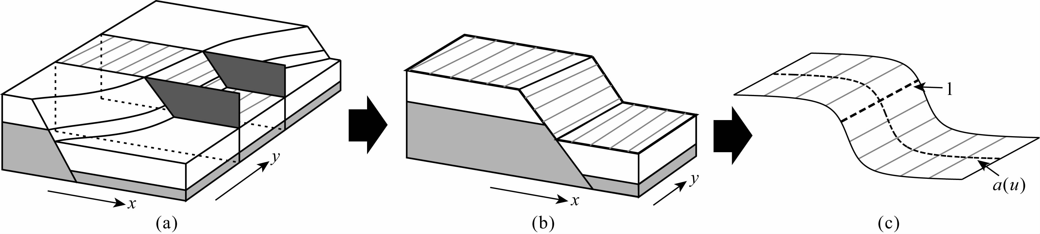 2 断裂模型分析如图 1a所示,通常断裂面表现为一个曲面,如果用两个相互平行的竖直平面切割这个断裂模型,则当两平面逐渐靠近时,将产生一个次级“阶梯状”模型,如图 1b所示.此时,断裂面将趋于一个平面,而断裂面同两侧地层界面的组合(图 1b中阴影部分)则表现为一个柱面,该柱面具有分段函数表达式.为了表征的方便,我们可以用另一个与之近似的可用连续函数表达的柱面(图 1c)对该模型进行拟合,进而提取所需属性来刻画断裂.令 r 表示图 1c中曲面,则有
