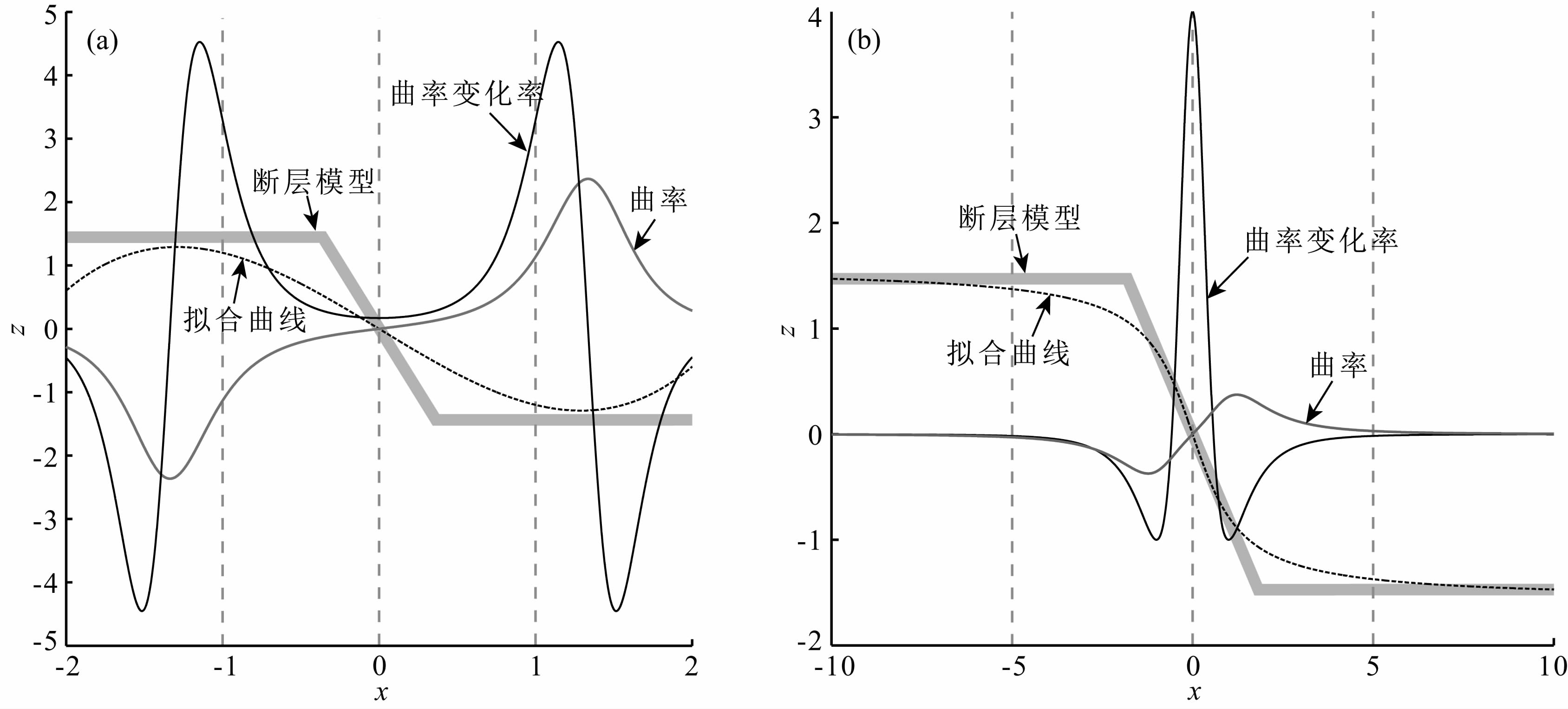 进一步的分析可知,对于三次曲线 z(x),其两端延伸方向同z轴(拟合时地震记录的垂向轴)夹角小于45°,但实际地层界面倾角多介于0°~45°,较少介于45°~90°,即界面延伸方向更趋于水平方向,而非竖直方向.特别是地震所能记录到的资料更是如此,如图 1c中准线两端延伸方向通常与x轴或y轴(横向)的夹角小于45°,而同z轴(垂向)夹角大于45°,这种同三次曲线的延伸方向的不一致就导致了拟合时时常产生“噪声”.如图 2a所示,为了对图中断裂模型较好地拟合,在选用三次曲线时,必须要加大三次函数中一次项的权重,如选 z=0.3x3-1.5x(其函数图形见图 2a中拟合曲线),可以对其中的断裂模型进行较为合适地拟合.该三次曲线的曲率及曲率变化率如图 2a所示,可见,同曲率相比,曲率变化率对断裂的敏感性更强,但是一个断裂对应了4个曲率变化率极值,这将会影响到计算结果的断裂分辨能力.本次研究,充分考虑了实际断裂模型的这一特点,选用反正切函数 z=-arctanx 来拟合断裂模型,如图 2b所示,反正切函数同断裂模型吻合很好,同时基于此函数的曲率变化率克服了三次曲线曲率变化率的不足,即只有一个极大值,这在利用该属性提取断裂信息时,能够有效地提高了计算结果的分辨率.