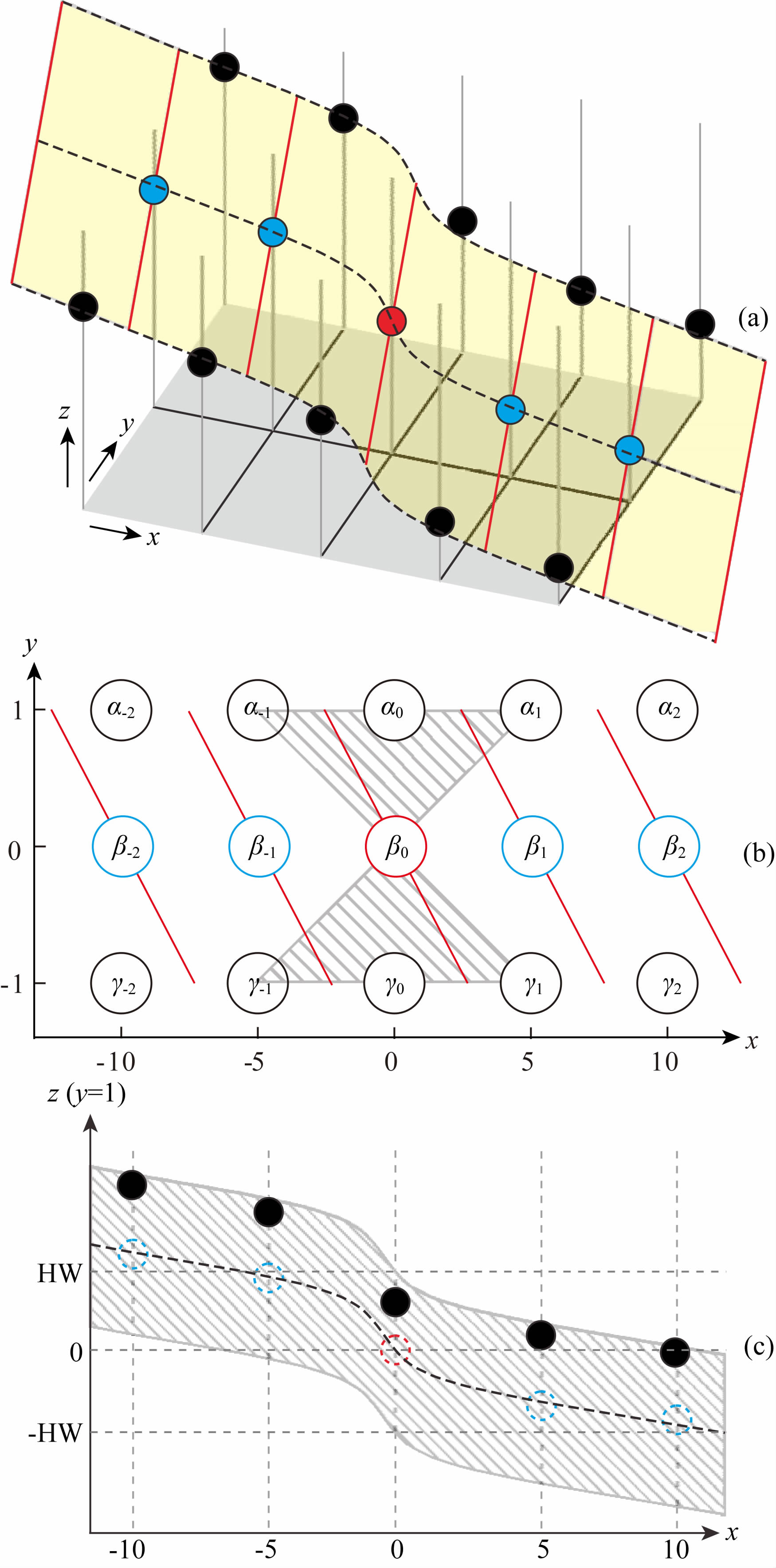 1)样点的拟合.基于前文断裂模型的分析,我们可以用反正切函数对断裂及两侧被断开的界面组合进行很好的拟合.以图 3a样点为例,其样点的空间分布如图 4a所示,各样点的编号如图 4b所示.令坐标原点位于分析点(红色实心圆表示).为了便于拟合,令x轴方向各相邻样点水平间距为5,这样样点分布范围为-10到10.如图 2b中拟合曲线所示,当以闭区间[-10,10]截取反正切函数时,其符合所期望的函数图形.另外,为了便于讨论,令y轴方向各相邻样点水平间距为1.在y=0平面,用以下一般的反正切函数