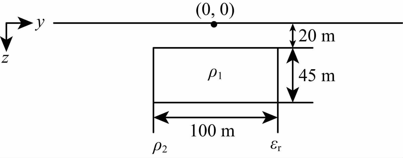 图 2 均匀半空间中赋存一矩形异常体,半空间电阻率为1 0000 Ωm,相对介电常数为5,矩形电阻率为1000 Ωm Fig. 2 A 2D model with a conductive block of ρ1=1000 Ωm in a half-space with a resistivity of ρ2=10000 Ωm and the constant relative dielectric permittivity εr=5 |