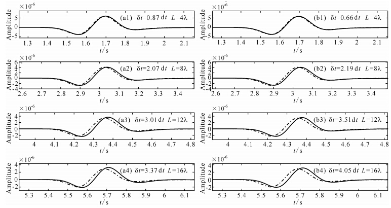 传播距离L变化时,地震记录也会相应的变化.图 5为当ε=0.01,a=0.75λ时,取角度为5°时的一条射线上的传播距离L分别为4λ,8λ,12λ,16λ时的高斯型和指数型自组织介质地震记录.随着传播距离的增加,在两种介质中,波形变形的程度会加重,在尾波中会出现低振幅震荡,并且互相关方法计算所得的到时差δT会随着传播距离L的增加而增加.