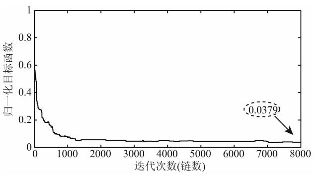 4.2 目标函数的求解假设一次新的znew的产生即一个新链,每个链上有m个t值,如果在状态tn下得到的目标函数J的数值相对状态tn-1下降了,即J(tn)<J(tn-1),则跳出最优t的搜索,然后将下一个链的zcurrent更新为当前状态tn下所得的zpropose(公式3),如果目标函数不降低,则保持该链的zcurrent不变,带入下一个链的计算,如此反复迭代直至目标函数满足收敛条件.