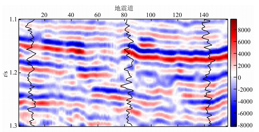 本次试算使用的地震资料共有157道,如图 14所示,纵向上采样率2 ms,从1.1 s到1.3 s,提取的子波主频为30 Hz,采用了三口井,分别位于10、88、142地震道位置处.