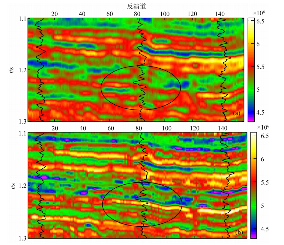 图 15显示了实际资料的反演结果,其中图 15a为稀疏脉冲反演方法所得结果,图 15b为本文方法所得结果,通过对比可以看出,虽然图 15a所示反演结果基本满足反演要求,但纵向分辨率低,对薄互储层展示效果不好,不能真实反映地下地质情况,因此难以满足油田生产需求.图 15b所示反演结果的纵向分辨率明显提高,砂泥岩互层得到很好的区分,砂体横向连续性也比较合理.从图中黑色椭圆标出的 位置可以看出,在1.25 s目的层附近的两个薄层得到了很好的区分,1.2 s附近的薄单砂体也能够清晰 地分辨,验证了本文提出的基于谱模拟的快速随机 反演方法在薄储层识别中的优势以及本文研究方法的有效性.