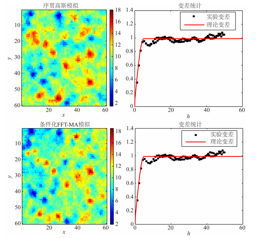 需要指出的是,高斯白噪z的存在使FFT-MA算法具有随机性,但由于协方差结构 C 不改变,所以这种扰动不会影响数据的空间变差结构.