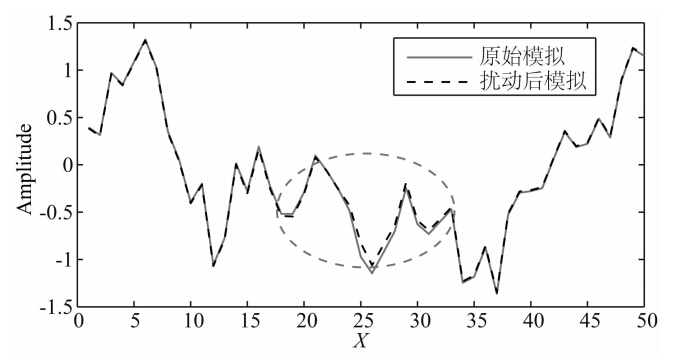 模拟分析结果表明,局部(一个点或者一条线)高斯白噪z值的扰动,会引起FFT-MA谱模拟结果的局部扰动.正由于FFT-MA谱模拟的这种特性,在对实际地震数据进行模拟时,通过对z值在某道位置的扰动,可以产生相应道位置处的模拟波阻抗 的扰动,因此,可以对实际地震数据按道进行模拟,实现模拟模型的连续修改,最终达到与实际地震记录的匹配.