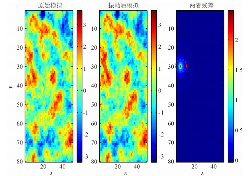 由方程(1)可知,FFT-MA谱模拟的最终结果受协方差C和高斯白噪z的影响,其中模拟的随机性来自于加入的随机高斯白噪z.图 4是一个50点的模拟,采用球状变差模型,变程值为10,在更新第25点的z值时,模拟结果在相关长度10以内均发生了扰动.图 5和图 6分别是网格大小均为80×60时的点和线扰动的情况,图 5是对位置(30,5)的点扰动,图 6是对第11列的线扰动,从图 5和图 6最右边的两者残差图可以看出,在相关半径内,模拟结果均发生了扰动.