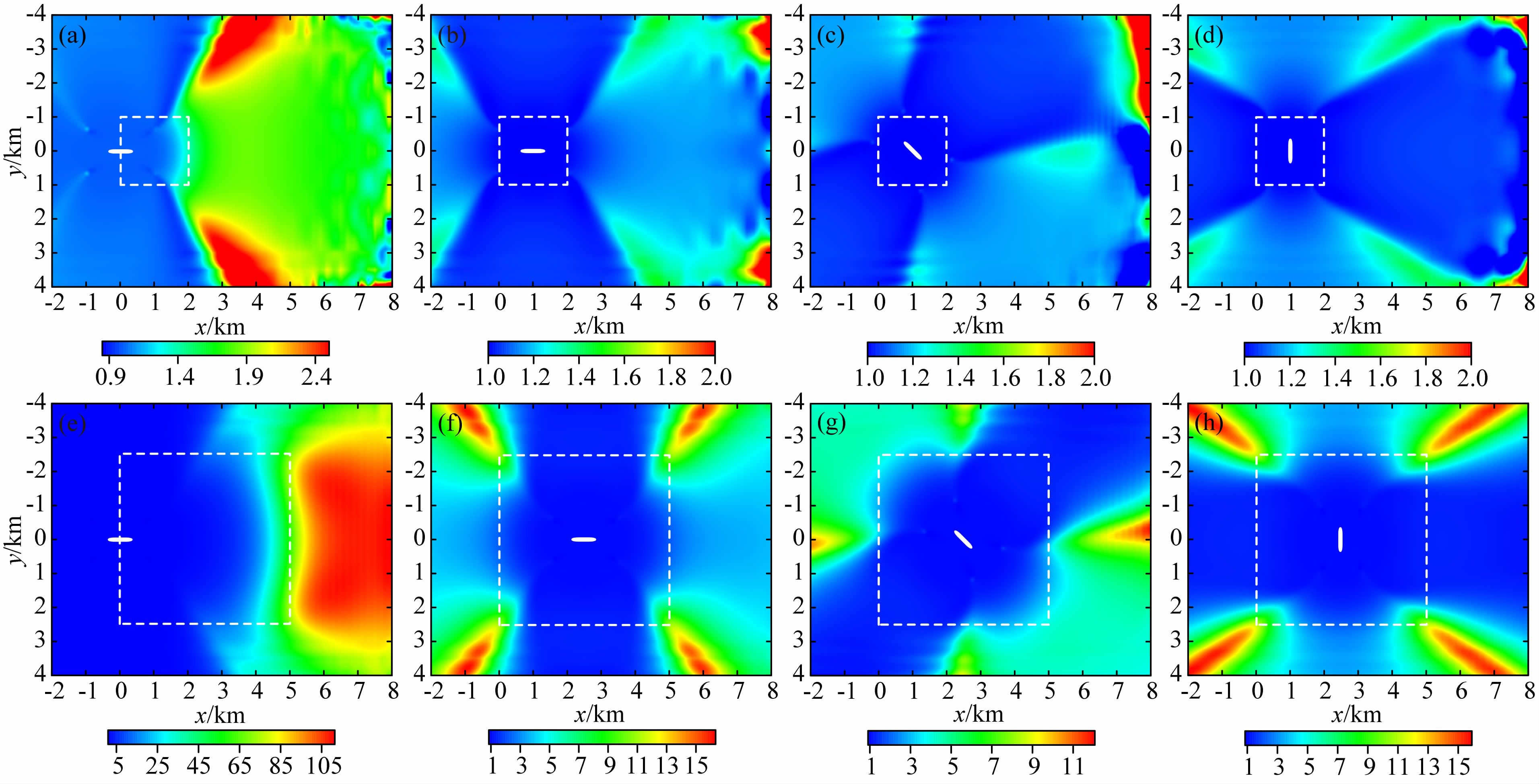 图 10 储层边长为2 km(a—d)和5 km(e—h)的模型在场源移动并旋转时的归一化水平电场分量Fig. 10 Normalized horizontal electric filed amplitude with the source moving and rotating for the model depicted in Fig. 8, with the reservoir edge length of 2 km(a—d) and 5 km(e—h) |