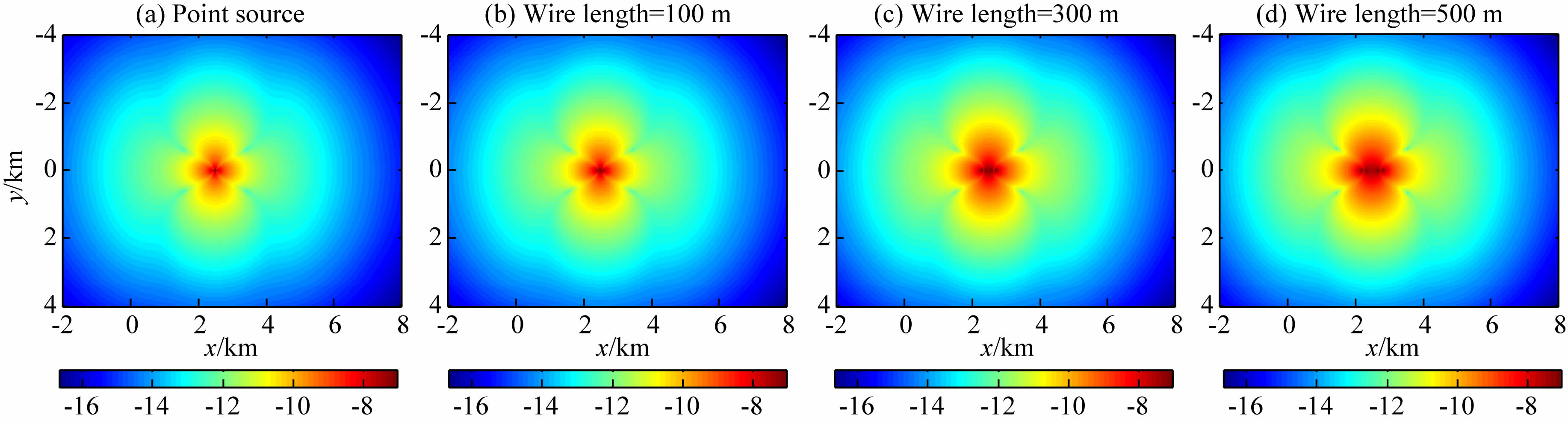 图 11 三维储层模型在点源与不同长度的线源激发下的Ex振幅(以10为底的对数)Fig. 11 Ex amplitude(on a log10 scale)for wire sources with various lengths for the 3D reservoir model |