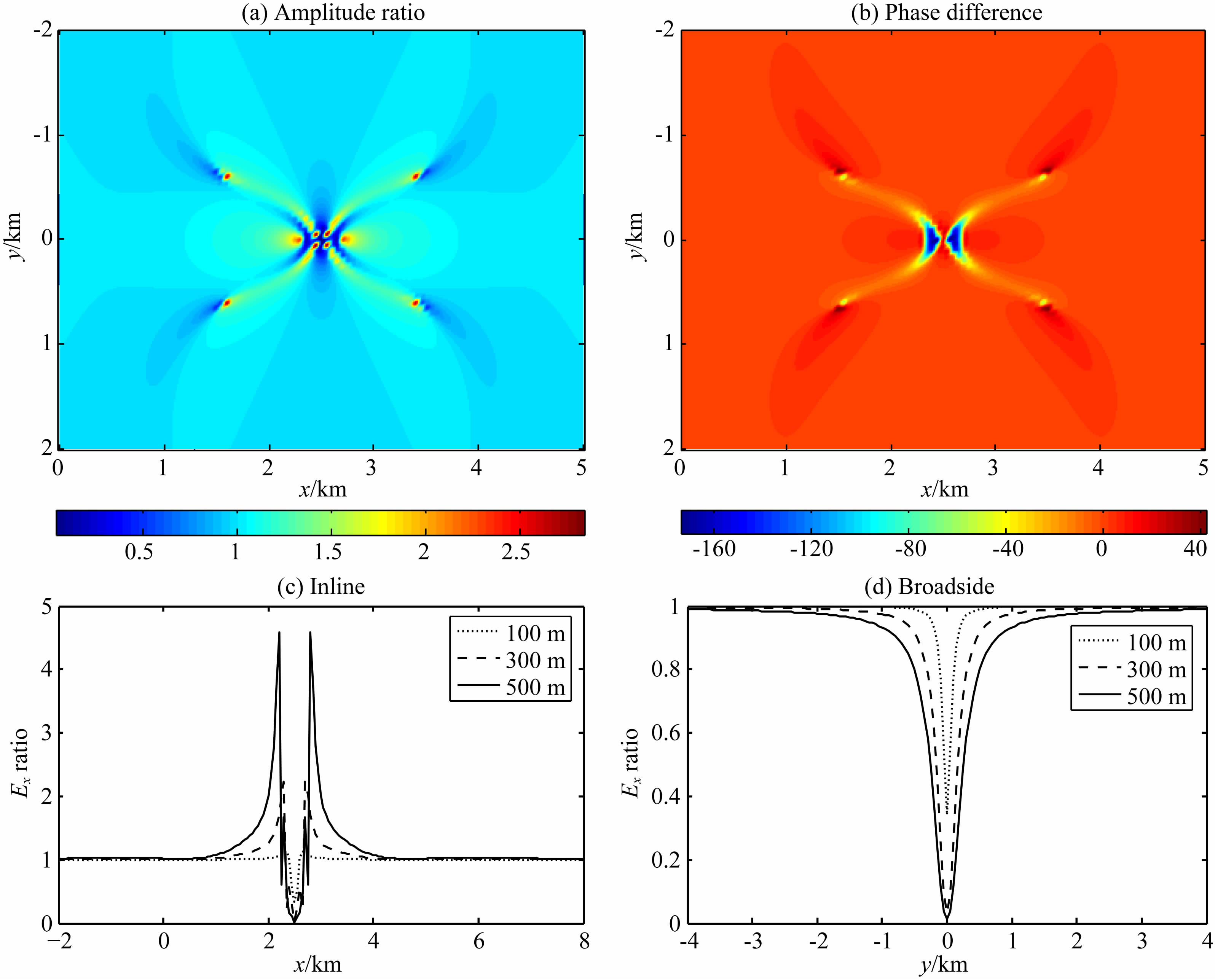 以上均为100 m长线源的计算结果,图 11和图 12则分别显示了点源和多个长度的线源的正演结果.这里使用储层边长为5 km的模型,场源位于储层中心正上方(图 10f).图 11a—11d分别为点源和100 m、300 m、500 m长的线源激发的Ex振幅在二维测网上的分布,从中可以粗略看出发射源长度的影响:点源的场的极大值区域聚焦于一个点,线源的场的极大值区域则聚焦于一条线,且场源长度越长,这条线的长度越长.图 12a和图 12b分别显示了一个相对较小的测网上300 m线源被点源归一化的Ex振幅和相位,可以看出,线源与点源的场差异最大的地方除了场源附近的一小片区域外,还包括一个延伸得较远的“X”型区域,在“X”的4个端点附近场的差异甚至与场源处相当.图 12c和图 12d分别为inline和broadside测线上的线源与点源的Ex振幅比,可以看出,在inline测线上场源中心点附近点源的场幅值强于线源的场,而当远离场源中心点一定距离时,则是线源的场较强,这是由于点源的能量都集中于一点,而线源的能量则均匀分布在导线上;对于broadside测线,在收发距不太大时点源的场幅值始终强于线源的场,且发射导线越长场越弱,这是因为点源始终处在导线上离broadside测点最近的地方.