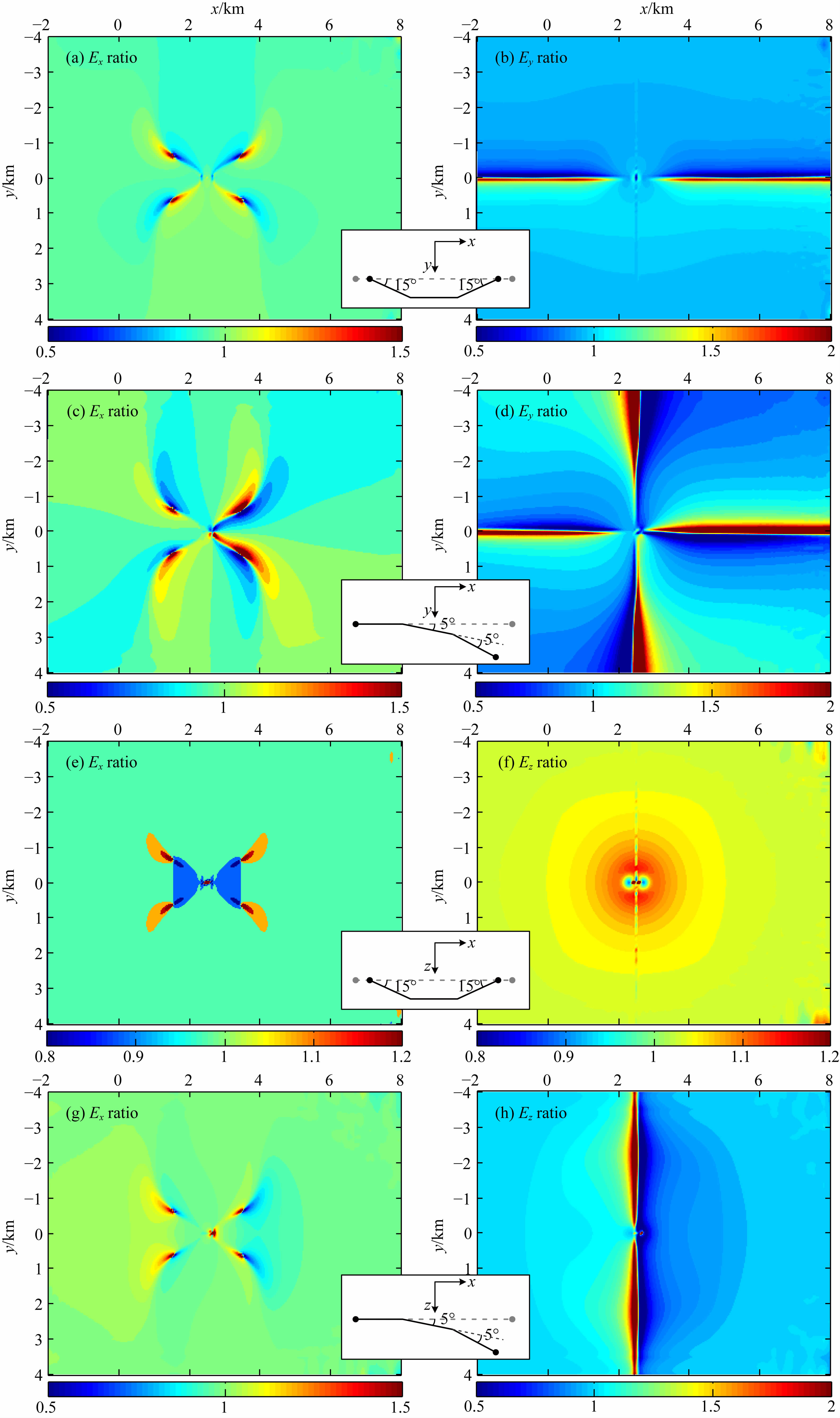 设计了几种简单的弯曲导线,如图 13所示(黑色实线),其中导线长度为300 m,平均分成3段发生偏离,灰色虚线表示未弯曲的导线;图 13a—13d为导线在水平面内弯曲,图 13e—13h为导线在垂直面内弯曲.仍然使用储层边长为5 km的模型,场源位于储层中心正上方(如图 10f).图 13显示的是弯 曲导线与直导线的电场振幅比.单独来看,图 13a,13b表明这种弯曲方式会使导线弯向的一侧场值变强,另一侧场值变弱,显然这是由于跟直线源相比一侧离场源的距离减小而另一侧离场源的距离变大了;Ey分量在inline测线两侧会发生从偏大到偏小或从偏小到偏大的突变,说明如果接收器没有严格地布设在inline测线上,则场源的这种弯曲会对观测结果造成很大的影响;正如所预期的,水平电场的差异是关于y轴对称的.在图 13c,13d的这种弯曲方式下,Ex和Ey分量的差异不再关于任何轴对称,而是近似关于场源中心点旋转对称;Ey分量的差异在inline测线和broadside测线两侧均会突变.当导线在垂直面内发生如图 13e,13f所示时的小角度弯曲时,电场差异非常小,这是因为导线的第一段和第三段在方位上的偏离相反,互相抵消了一部分影响.图 13g,13h的这种弯曲方式下Ez分量的差异会在broadside测线两侧发生突变.若将图 13e,13f与13g,13h对比,将图 13a,13b与图 13c,13d对比,可以发现当导线端点的连线发生方位上的偏离时,其影响明显比未偏离时大.